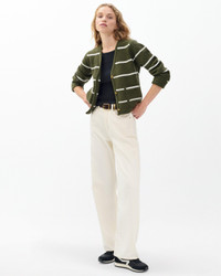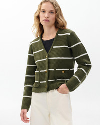 A classic, reimagined. This striped V-neck cardigan updates the lady jacket silhouette with a relaxed fit and super-soft wool in a textured stitch. Braided metal buttons add further depth and dimension. Size & Fit • Relaxed fit • Fits true to size • Size small: Body length 20", chest 36.5", sweep 36", sleeve length 22.5 • Model is 5'9.5" wearing size small Features & Details • 100% Wool • Front button closure • Patch pockets at hips • Machine wash inside cold with like colors • Lay flat to dry • Cool iron on the reverse side if needed or dry clean • Imported Product ID: RG9H25F6MWL