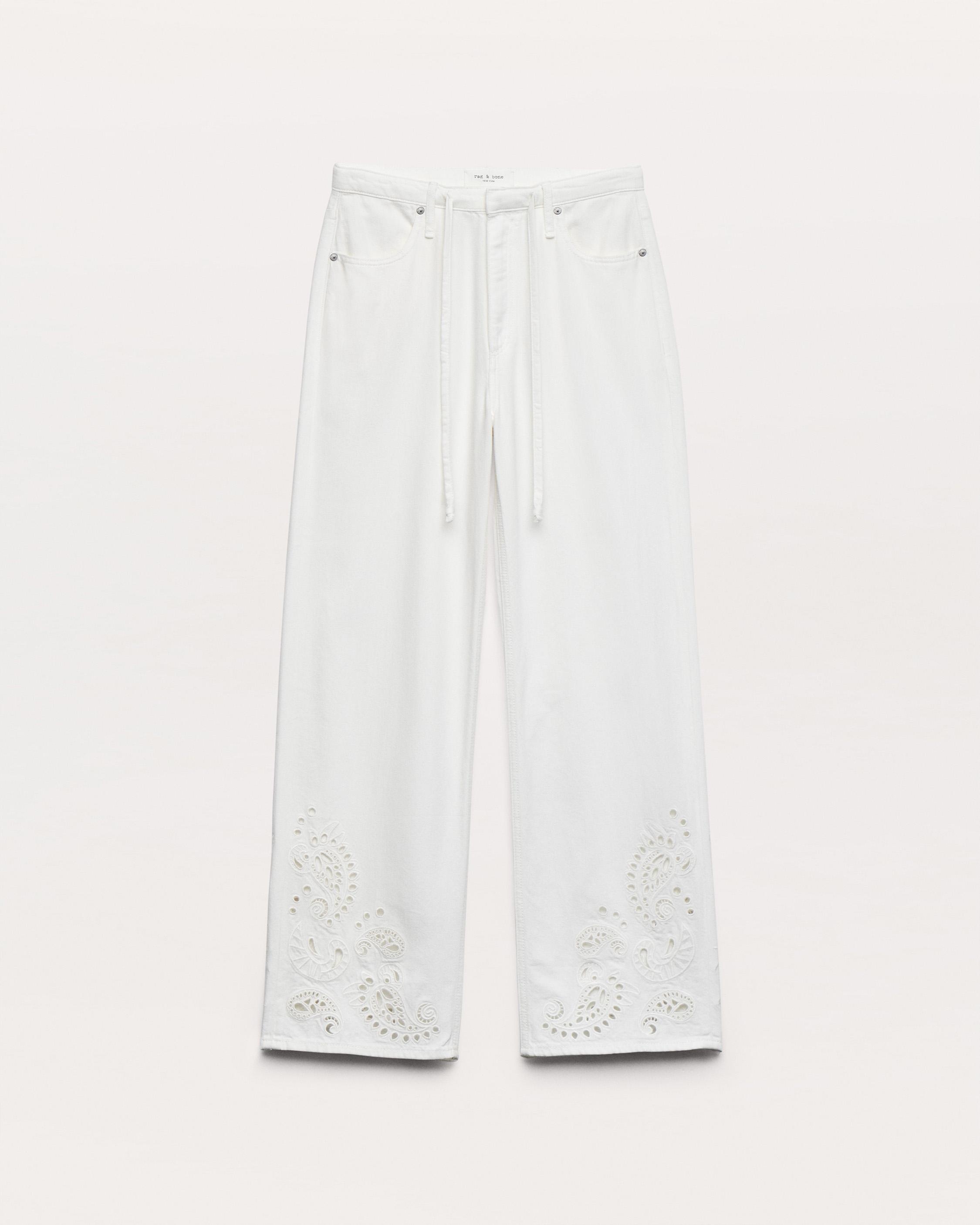 The Phoebe Beach Pant. Mid-rise jeans made for warmer days with a relaxed, laid-back fit and a drawstring waistband. Crafted from Ultra Featherweight, the lightest version of our supremely soft and airy denim with an effortless drape. In White Eyelet, a clean white wash featuring cutout paisley patterns embroidered at the hem. Size & Fit • Mid-rise • Relaxed wide, full-length leg • Size S: 12" front rise | 30.5" inseam | 20" leg opening • Model is 5'11" wearing size small Features & Details • 60% cotton, 40% lyocell • Ultra Featherweight Denim • In White Eyelet, a clean white wash featuring cutout paisley patterns embroidered at the hem • Zip fly with a drawstring and hook & bar closure • Front scoop pockets & back pockets • Hand wash only • Imported Product ID: WDD25P1009UFWE