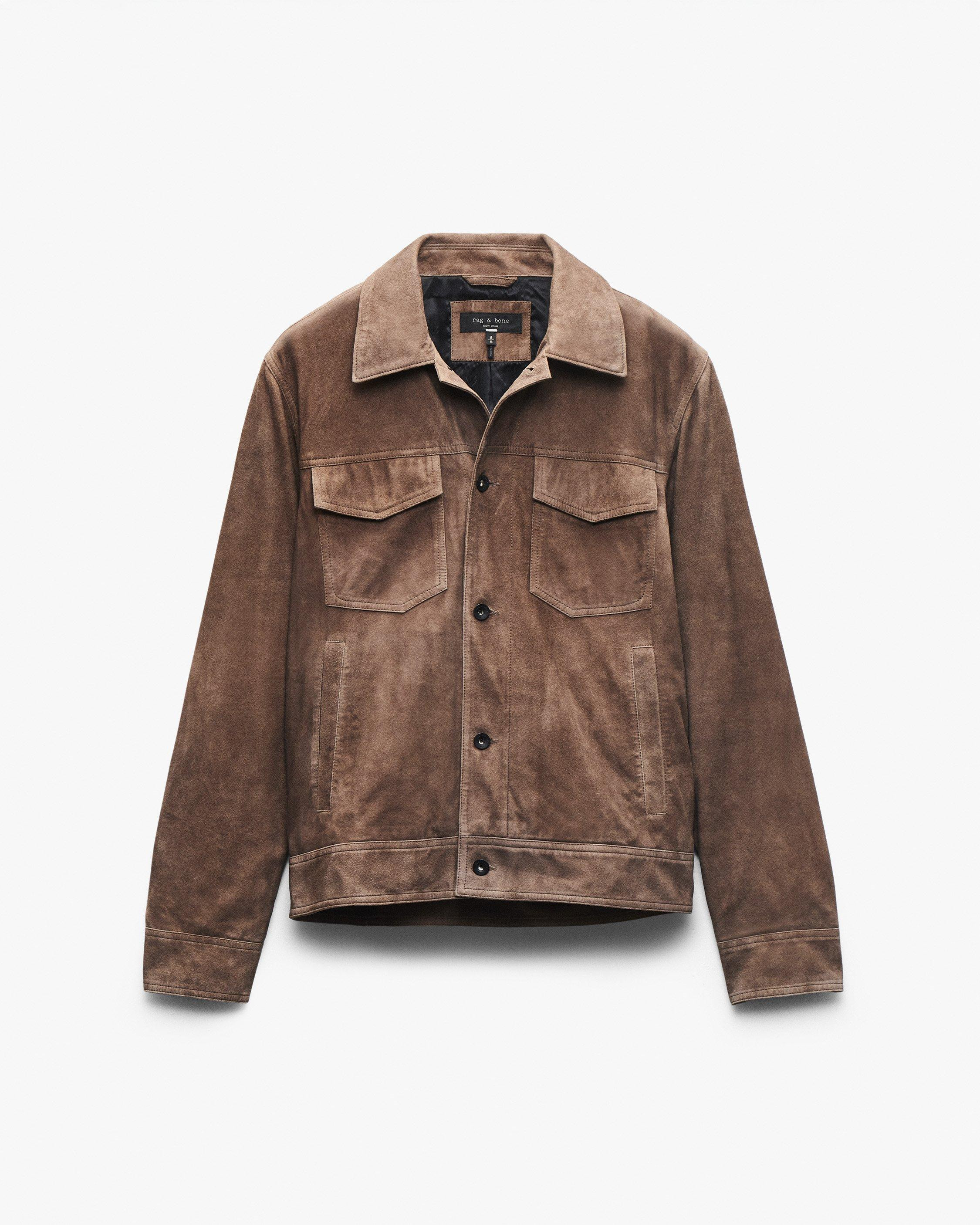 The denim trucker jacket, expertly reinterpreted in velvety suede and finished with our signature jacquard dagger-logo lining. This refined take on the Americana classic is dyed and washed to create a beautiful depth of color with nuanced highs and lows throughout. Size & Fit • Fits true to size • Size Medium: Back length 26", chest 45", sleeve length 35.25" • Model is 6'2" wearing size medium Features & Details • Body: 100% goat suede • Lining: 52% polyester, 48% viscose/rayon • Professional leather cleaner only • Tack donut buttons at center front & buttons at cuff • Side entry waist pockets • Tack button closure • Imported Product ID: RV7525F0MLT