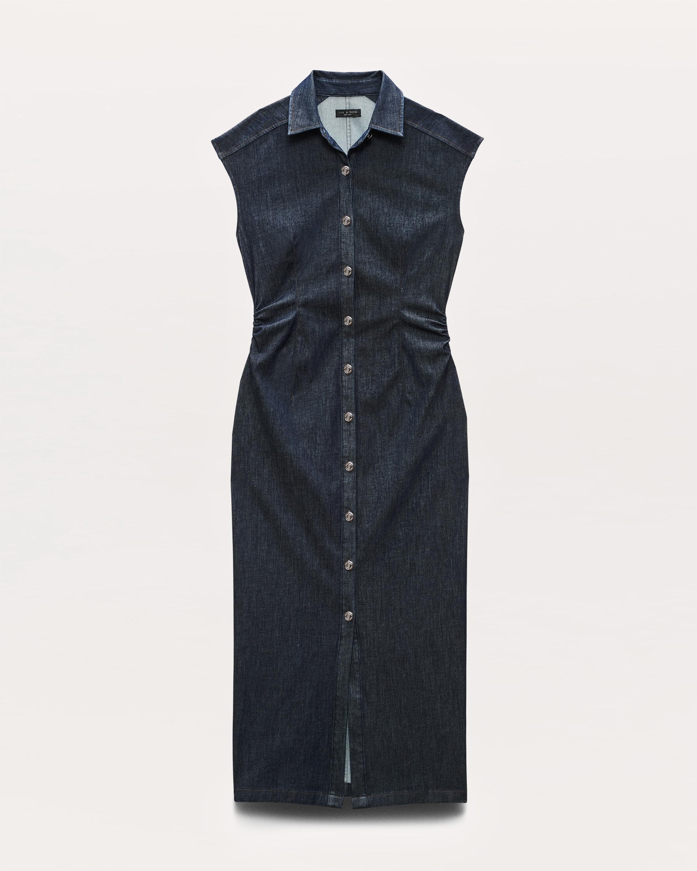A denim dress that feels as good as it looks. This sleeveless shirtdress is tailored from rbAIRFLEX, our breathable new stretch denim that's light as air and made for a life in motion. The modern material ensures its sleek profile, created through a slim fit and nipped waist, is always comfortable. In Rinse, a dark indigo wash. Size & Fit Slim fit midi-length dress Size Small: Front length 52 1/2", chest 35", sweep 35 1/2" Model is 5'10" wearing size 2 Features & Details 51% Cotton, 25% Polyester, 12% Lyocell, 8% Acetate, 4% Spandex Machine wash cold inside out with like colors, gentle cycle, do not use bleach, hang to dry, low iron if need, color may transfer Branded rag & bone buttons at center front Imported Product ID: WDD25SW181FXRI