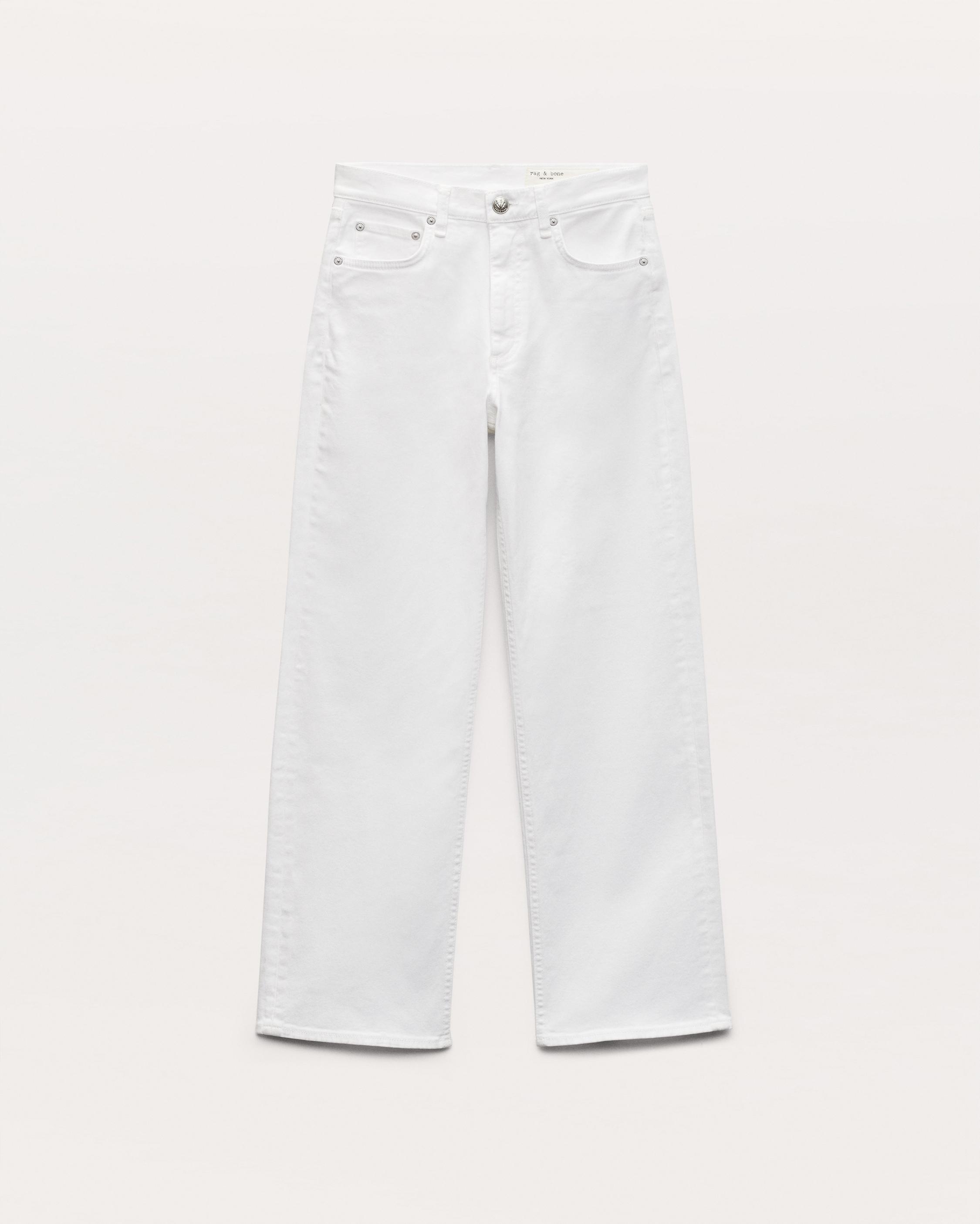 The Shea. Ankle-length high-rise jeans designed with relaxed, straight legs. Crafted from Lightweight Rigid non-stretch denim that provides structure, but breaks in over time for a soft and comfortable feel. In bright Optic White. Size & Fit • High-rise • Relaxed straight, ankle-length leg • Size 26: 12" front rise, 30" inseam, 18.25" leg opening • Model is 5'11" wearing size 25 Features & Details • 100% cotton • Lightweight Rigid Denim • In Optic White • Machine wash • Signature dagger tack buttons & washer rivets • Zip fly with a button closure • Five-pocket pant • Imported Product ID: WDD25S3018VSOP
