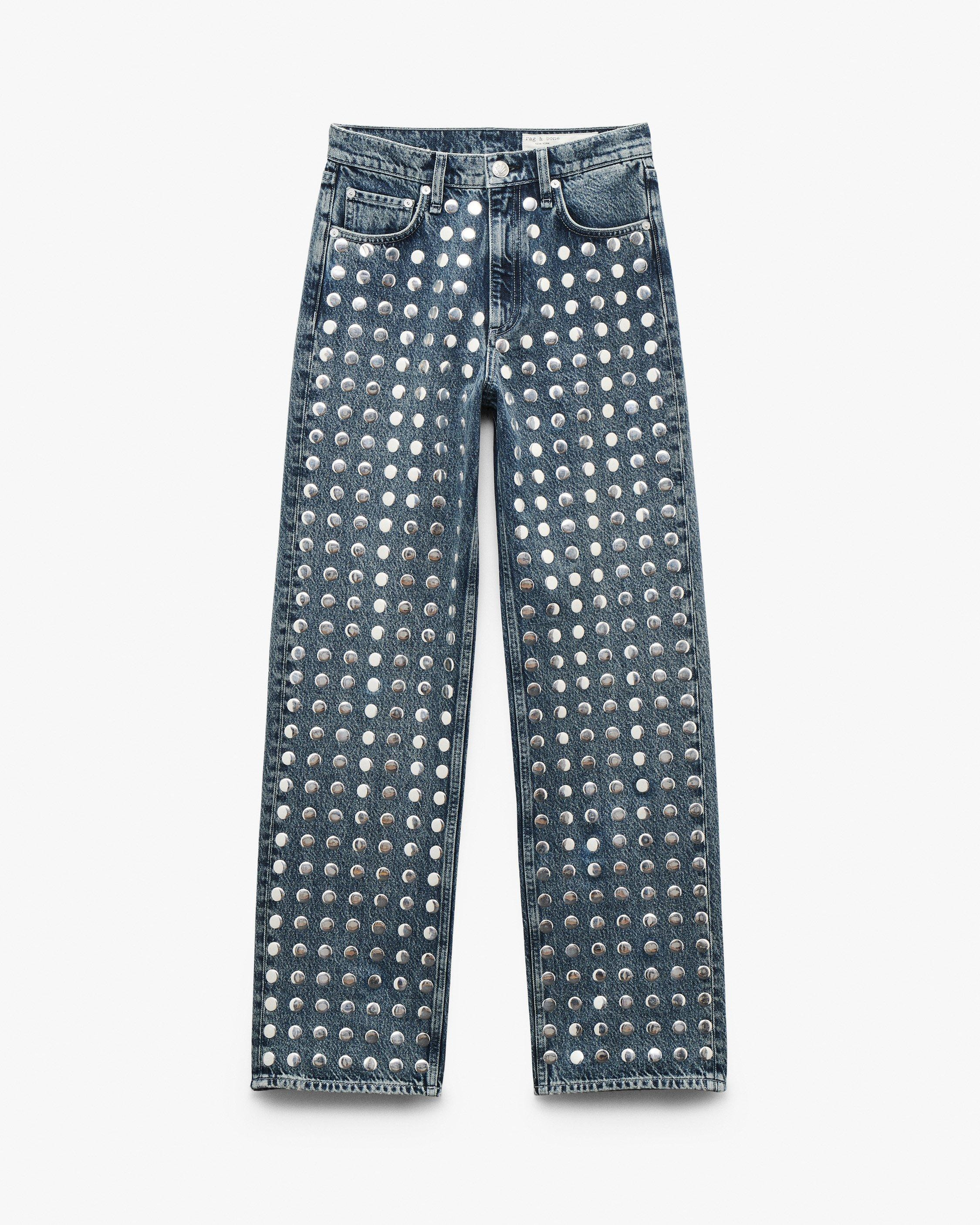 The Shea. High-rise jeans with a fitted waist and a relaxed, straight leg. An easy, everyday fit. Crafted from Lightweight Rigid non-stretch denim that provides structure, but breaks in over time for a soft and comfortable feel. In Studded Kingston, a medium-dark indigo wash with bold, heat-sealed domed studs down the front. Size & Fit • High-rise • Relaxed straight, full-length • Fits true to size • Size 26: 11.75" front rise, 32" inseam, 18.25" leg opening • Model is 5'11" wearing size 23 Features & Details • 100% cotton • Lightweight Rigid Denim in Studded Kingston, a medium-dark indigo wash with heat-sealed domed studs down the front • Dry clean only • Signature dagger button and branded rivets • Zip fly with button closure • Five-pocket silhouette • Imported Product ID: RJ3925F1RKS