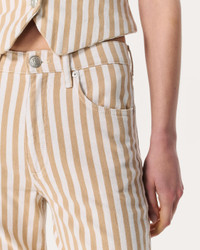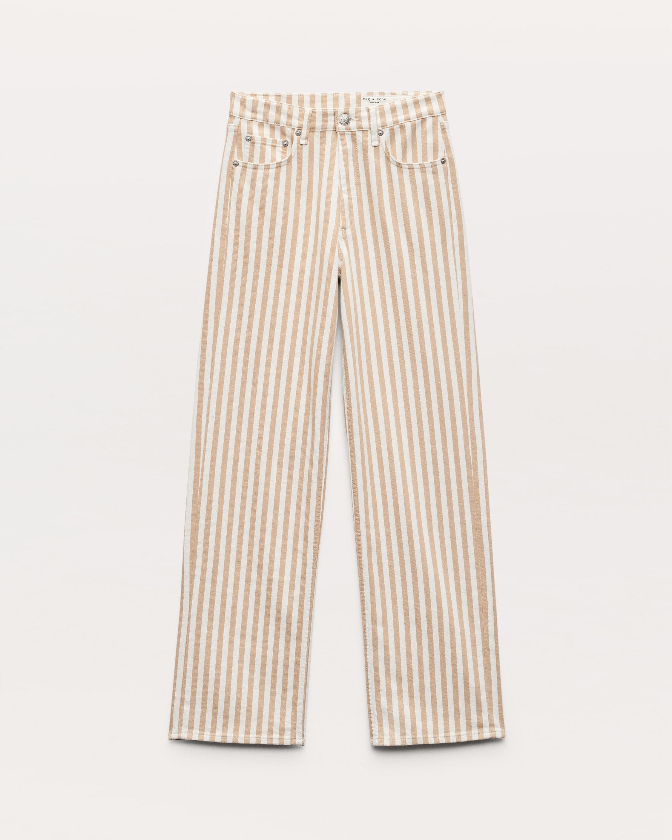 The Shea. Full-length high-rise jeans designed with relaxed, straight legs. Crafted from our Vintage Stretch denim for a broken-in look & feel with a comfortable touch of stretch. In Tan Stripe, a summery take on the classic pattern. Size & Fit • High-rise • Relaxed straight, full-length leg • Size 26: 12" front rise | 32" inseam | 18" leg opening • Model is 5'11" wearing size 25 Features & Details • 85% cotton, 13% linen, 2% elastane • Vintage Stretch Denim • In Tan Stripe, a summery pattern of vertical tan and ecru stripes • Zip fly with a button closure • Signature dagger tack buttons & washer rivets • Five-pocket pant • Machine wash • Imported Product ID: WDD25P1007VSTS