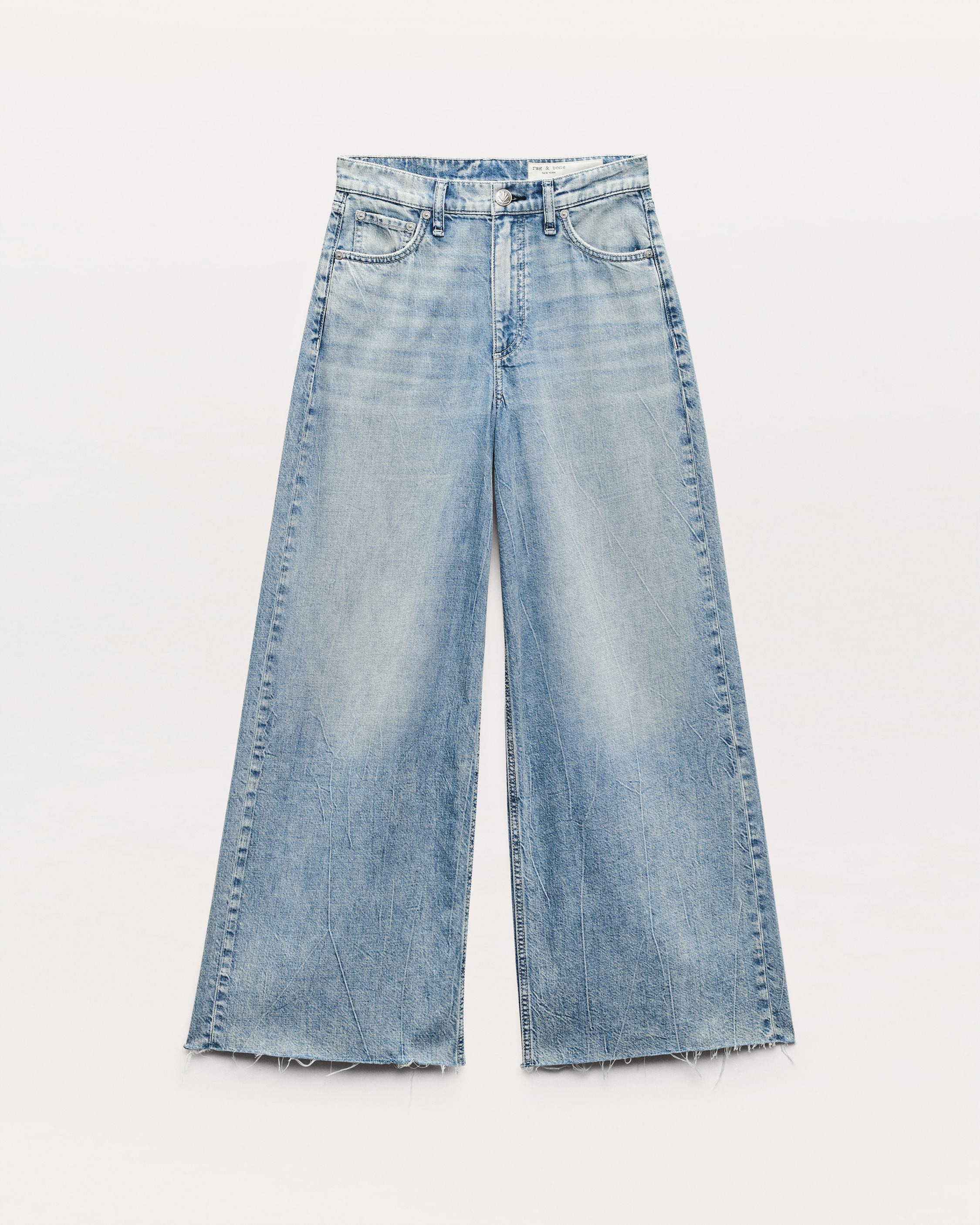 The Sofie. High-rise jeans with super-wide cropped legs that are rag & bone office favorites. Crafted from our Featherweight denim that's supremely soft and super light, with an easy drape. Feels airy & effortless. In Mira, a light indigo wash with a cut hem. Size & Fit • High-rise • Relaxed wide, ankle-length leg • Size 26: 12" front rise | 30" inseam | 25.25" leg opening • Model is 5'11" wearing size 25 Features & Details • 64% cotton, 36% lyocell • Featherweight Denim • In Mira, a light indigo wash with a cut hem • Zip fly with a button closure • Signature dagger shank button, metal rivets • Signature dagger shank button, metal rivets • Machine wash cold inside out on delicate & lay flat to dry • Color may bleed • Imported Product ID: RJ1425F1FMI