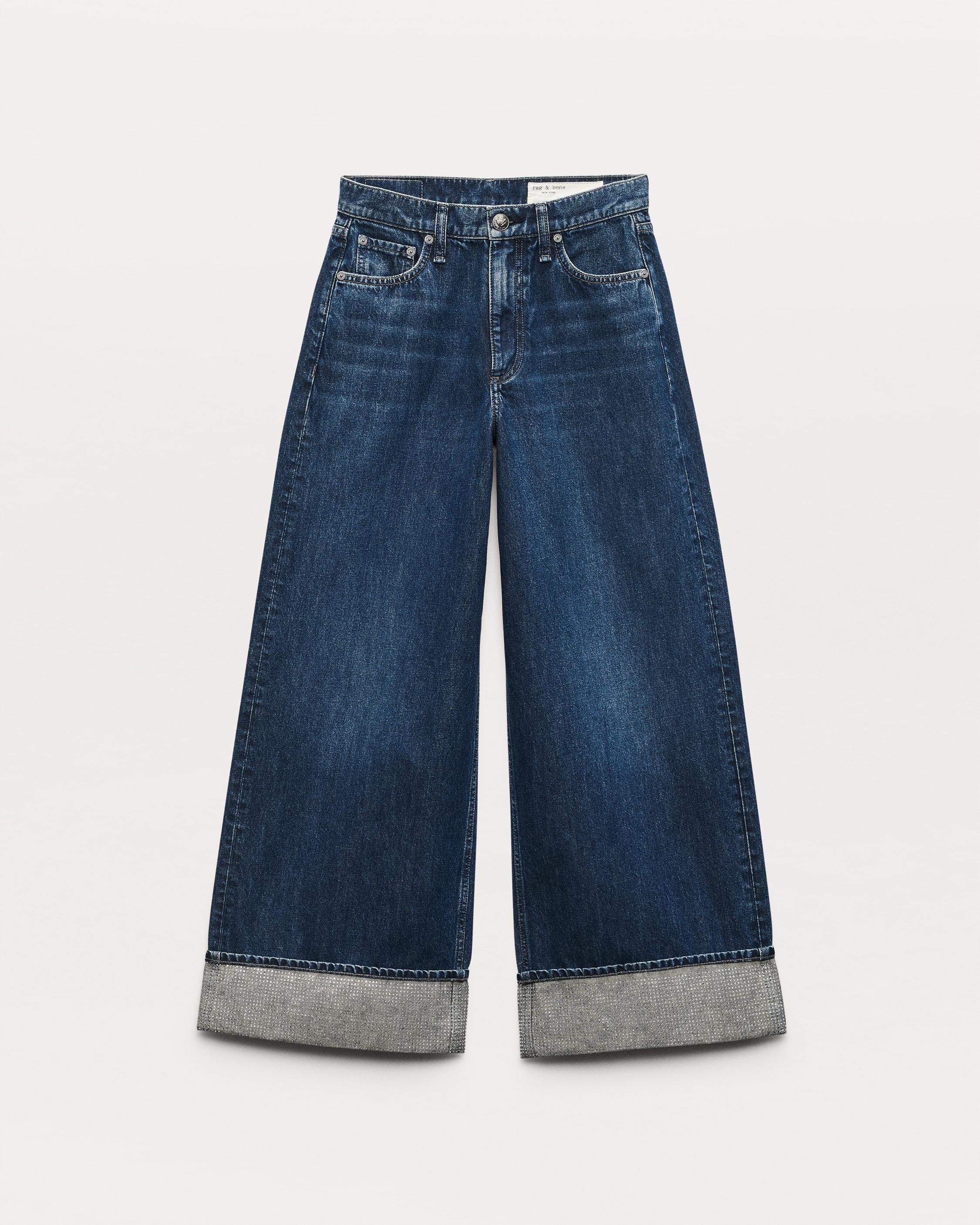 The Sofie. High-rise jeans with super-wide cropped legs that are rag & bone office favorites. Crafted from Lightweight Rigid non-stretch denim that provides structure, but breaks in over time for a soft and comfortable feel. In Bejeweled Dawn, a medium-dark indigo wash with a broad cuffed hem embellished with crystals. Size & Fit • High-rise • Relaxed wide, ankle-length leg • Size 26: 12" front rise, 29" inseam (cuffed), 33" inseam (uncuffed), 24.75" leg opening • Model is 5'11" wearing size 25 Features & Details • 100% cotton • Lightweight Rigid Denim • In Bejeweled Dawn, a medium-dark indigo wash with a broad cuffed hem embellished with crystals • Dry clean • Signature dagger tack buttons & washer rivets • Heat-sealed crystals at cuff • This garment is delicate. Please handle with care. • Due to the unique dyeing process of the fabric, some color transfer may occur. • Zip fly with a button closure • Five-pocket pant • Imported Product ID: WDD25P1010RGDJ