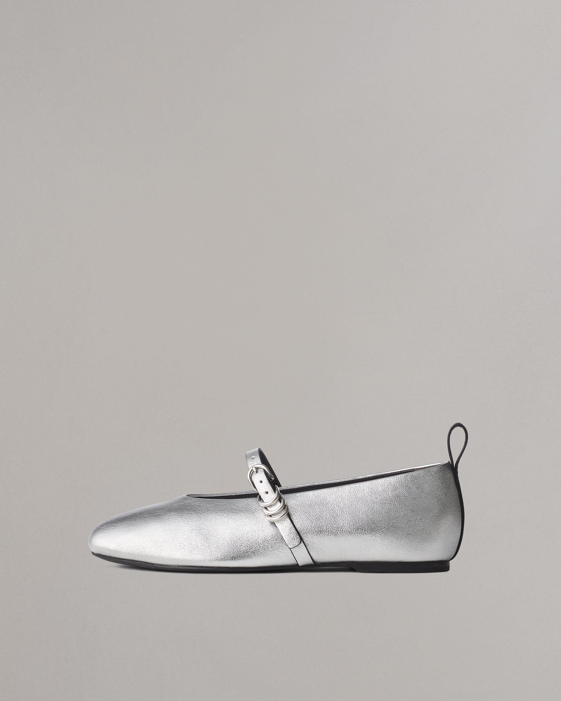 Crafted from luminous metallic leather, this take on classic Mary Jane flats features a buckled instep strap accented by a trio of D-rings. Inside, you'll find dual-density antimicrobial foam insoles: OrthoLite® Lazy-Hybrid™ for custom-fit comfort, and OrthoLite® Recycled for stability and support. Size & Fit 0.7" Polished stacked leather heel Features & Details Upper: 100% Calf Leather Outsole: 97% Leather, 3% Rubber Lining: 100% Calf Leather Professional leather cleaner Round toe Mary Jane Leather strap with custom triple ring hardware Logo webbing pull tab at heel for ease of entry Unlined Leather outsole Imported Product ID: WFF24SF001TR1