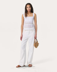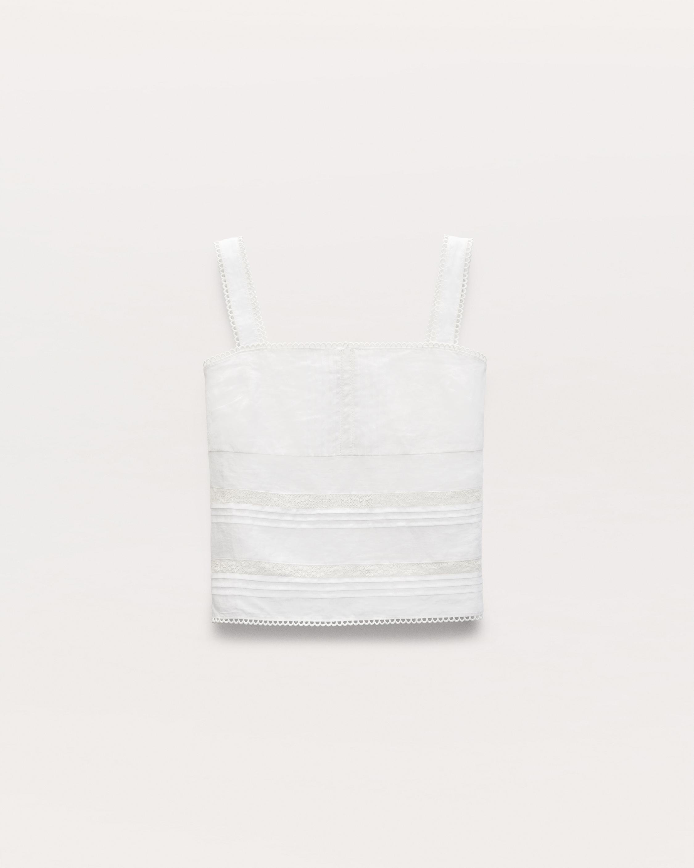 Feminine, but not fussy. Crafted from ramie, a natural, linen-like fabric that's lightweight & breathable, this unlined tank is made for beach walks, alfresco dinners, and everywhere in between. Tonal pintucks, scalloped trims, and semi-sheer, floral-patterned lace create the right mix of romantic texture that feels easy yet elevated. Size & Fit • Relaxed fit • Fits true to size • Size Small: Back length 11.75", chest 34.5", sweep 45.5" • Model is 5'9" wearing size small Features & Details • 100% ramie • Machine wash cold & lay flat to dry or dry clean • Do not twist or wring • Self-covered buttons at side seam • Scalloped trim at straps and body edges • Inserted lace trim at body • Unlined • Buttons at side seam • Imported Product ID: WAW25PA0266926