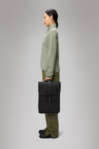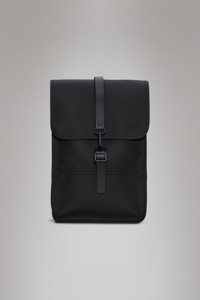 Backpack Mini is a downscaled version of Backpack. Silhouette is characterized by its squared shape and flap with magnet snap fastenings. This clean and ever contemporary rucksack features an internal laptop pocket, a spacious main compartment and a concealed external phone pocket on the back panel. The laptop pocket fits a 13" laptop with sleeve, making the squared backpack a perfect computer-ready staple for commuting on bike or by foot. Backpack Mini is cut from Rains' signature PU fabric, engineered for carrying strength, durability and a smooth feel. SKU: 13020\01 Details Composition: 100.00% PES (Polyester) Water column: 8000 mm Weight: 31.4 oz Features - Waterproof signature PU fabric - Flap with magnet snap fastenings - Single main compartment - External back zip pocket - Internal zip pocket - Flat pocket fits 13" laptop - Adjustable shoulder straps - Webbing carry handle