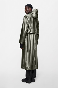 Bold Longest Jacket is a unisex rain jacket with a longer and more exaggerated fit. The elevated design delivers high functionality in a bold silhouette. Bold Longest Jacket is playing with details in a courageous way. Design features a hood with tie cord, zipper closure under a storm flap with invisible snaps and snap closure at cuffs. Back features an exaggerated yoke with mesh lining underneath for breathable comfort. The maxi jacket is completed with a string adjustment at waist and two wide welt slip in pockets to transport and keep your essentials dry moving through the city. This design is cut from Rains’ signature PU fabric and features welded seams. The finish is lightweight with a smooth feel. SKU: 12120\150 Details Composition: 100.00% PES (Polyester) Water column: 5000 mm Windproof: Protection against windchill Fit: Longest Weight: 30.3 oz Features:
