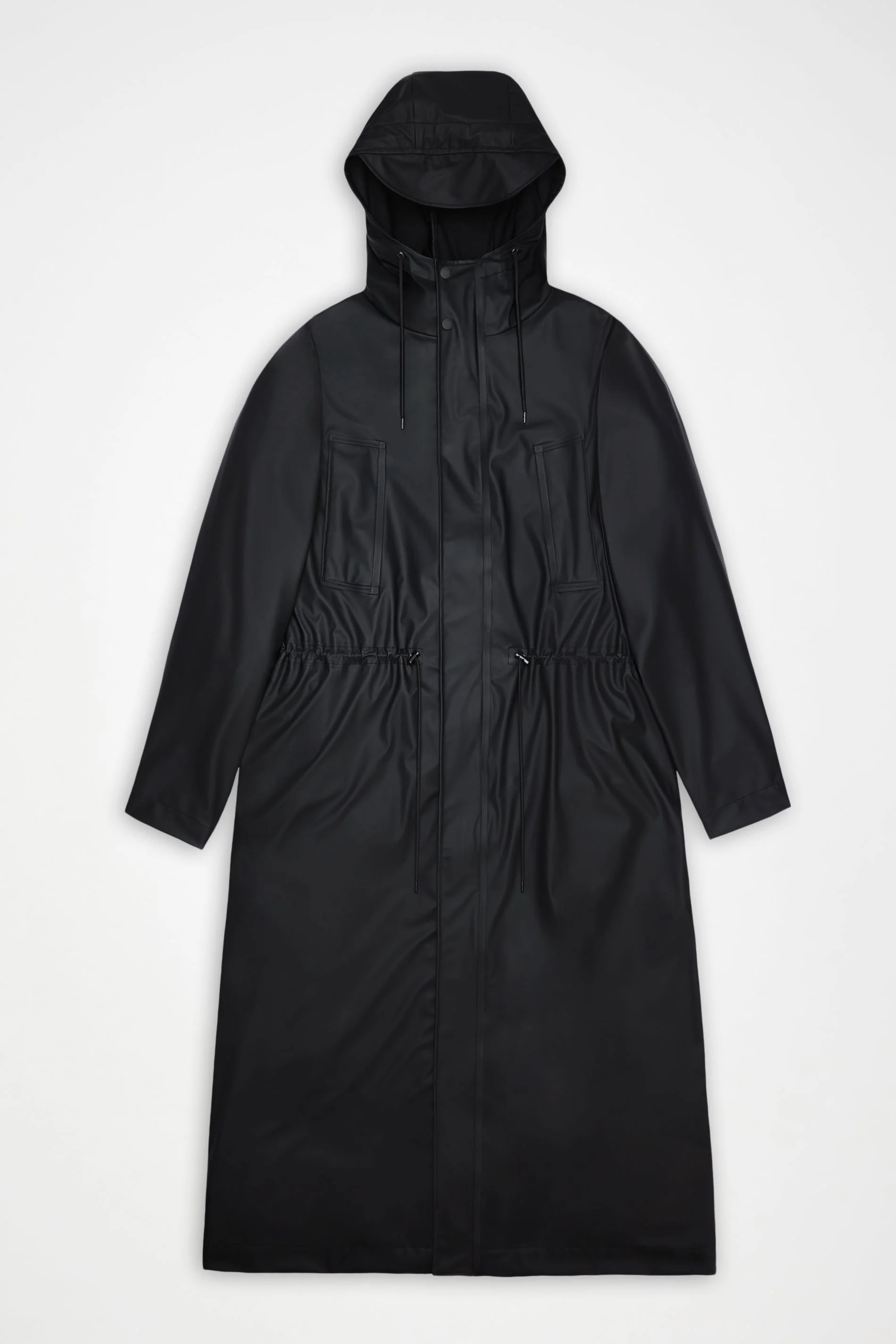 Bold Longest Jacket is a unisex rain jacket with a longer and more exaggerated fit. The elevated design delivers high functionality in a bold silhouette. Bold Longest Jacket is playing with details in a courageous way. Design features a hood with tie cord, zipper closure under a storm flap with invisible snaps and snap closure at cuffs. Back features an exaggerated yoke with mesh lining underneath for breathable comfort. The maxi jacket is completed with a string adjustment at waist and two wide welt slip in pockets to transport and keep your essentials dry moving through the city. This design is cut from Rains’ signature PU fabric and features welded seams. The finish is lightweight with a smooth feel. SKU: 12120\01 Details Composition: 100.00% PES (Polyester) Water column: 5000 mm Windproof: Protection against windchill Fit: Longest Weight: 30.3 oz Features: