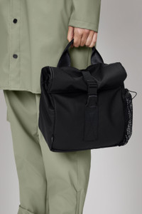Lunch Bag Large is an insulated bag, made in a sharing size to fit your standard 6 pack of canned drinks or larger food storage boxes. Design features a single main compartment to accommodate bento box style food storage boxes or medium tupperware. The outside features a zipper pocket and side bottle pocket with drawstring fastening. The bag is finished off with a secure closure with a plastic buckle and a webbing carry handle. The bag is easy to clean inside and out after a day on the go and folds down flat when not in use. The Lunch Bag Large is cut from Rains’ signature PU fabric lined with isothermic aluminum for added insulation. This bag will ensure the freshness of your hot or cold food items. SKU: 14450\01 Details Composition: 100.00% PES (Polyester) Water column: 5000 mm Weight: 9.5 oz Features - Waterproof signature PU fabric - Lined with isothermic aluminum for insulation - Secure closure with plastic buckle - Fit for approx 1L food storage boxes or drinks - Single main compartment - Exterior zipper pocket - Exterior side bottle pocket, drawstring fastening - Webbing carry handle