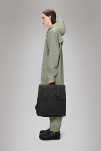 MSN Bag reinterprets the classic school backpack for city-ready wardrobes. Characterized by a minimalistic silhouette and flap with carabiner closure. This bag features an internal laptop pocket, a spacious main compartment and finished off with snap compressions at opening and sides. The laptop pocket fits a 13" laptop with sleeve, making the MSN Bag a perfect computer-ready staple for everyday commutes. MSN Bag is cut from Rains' signature PU fabric, engineered for carrying strength, durability and a smooth feel. SKU: 13300\01 Details Composition: 100.00% PES (Polyester) Water column: 8000 mm Weight: 30.7 oz Features - Waterproof signature PU fabric - Flap with signature carabiner closure - Single main compartment - Padded pocket fits 13" laptop - Snap compressions at opening - Side-mounted snap compression - Adjustable shoulder straps - Webbing carry handle