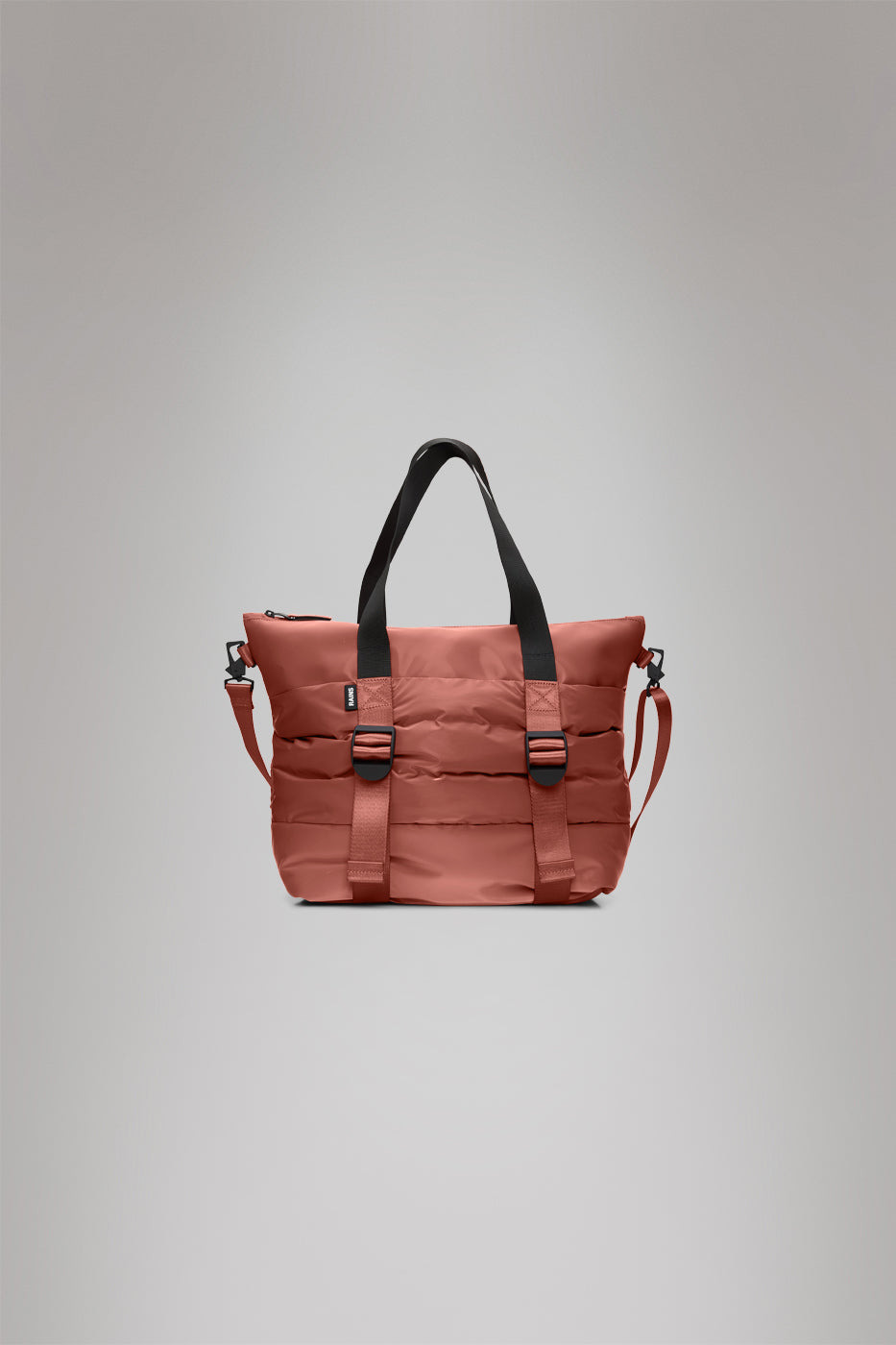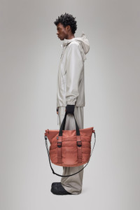 Puffer Mix Tote Bag Mini is a restyled version of the classic Tote Bag design. This playful mini tote is compact, yet large enough to meet your everyday carry needs. Puffer Mix Tote Bag Mini features a main compartment with an internal secure zip pocket - perfect for shopping, commutes or at the office. On the exterior, adjustable front straps hold space for extra storage. The design is finished off with webbing carry handles and attachment rings for an included detachable shoulder strap. Puffer Mix Tote Bag Mini mixes the iconic puffer aesthetic with Rains’ well-known functionality and durability. It’s cut from signature waterproof PU fabric, engineered for carrying strength and a smooth feel. SKU: 14010\125 Details Dimensions: 15.4 in x 6.3 in x 16.5 in Capacity: 4.2 gal Composition: 100.00% PES (Polyester) Water column: 5000 mm Weight: 24.3 oz Features - Waterproof signature PU fabric - Coated zip closure - Single main compartment - Internal secure zip pocket - Adjustable front straps for exterior storage - Detachable adjustable webbing shoulder strap - Webbing carry handles - Silicone flag label