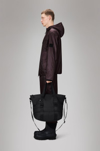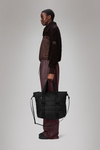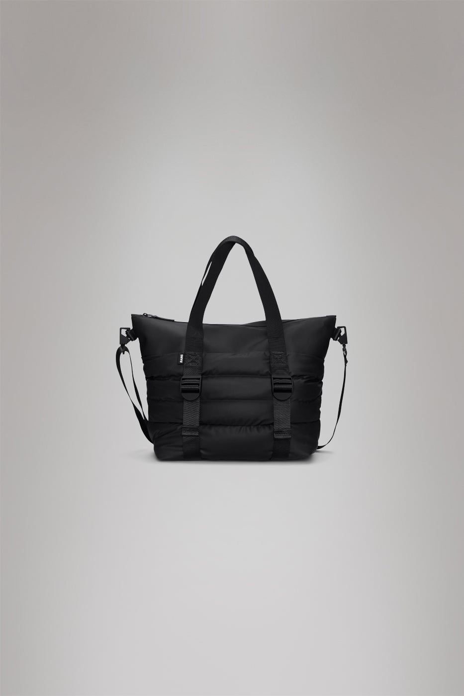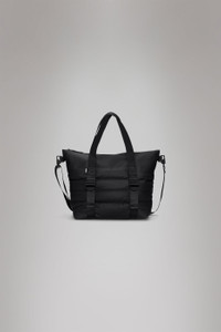 Puffer Mix Tote Bag Mini is a restyled version of the classic Tote Bag design. This playful mini tote is compact, yet large enough to meet your everyday carry needs. Puffer Mix Tote Bag Mini features a main compartment with an internal secure zip pocket - perfect for shopping, commutes or at the office. On the exterior, adjustable front straps hold space for extra storage. The design is finished off with webbing carry handles and attachment rings for an included detachable shoulder strap. Puffer Mix Tote Bag Mini mixes the iconic puffer aesthetic with Rains’ well-known functionality and durability. It’s cut from signature waterproof PU fabric, engineered for carrying strength and a smooth feel. SKU: 14010\01 Details Dimensions: 15.4 in x 6.3 in x 16.5 in Capacity: 4.2 gal Composition: 100.00% PES (Polyester) Water column: 5000 mm Weight: 24.3 oz Features - Waterproof signature PU fabric - Coated zip closure - Single main compartment - Internal secure zip pocket - Adjustable front straps for exterior storage - Detachable adjustable webbing shoulder strap - Webbing carry handles - Silicone flag label