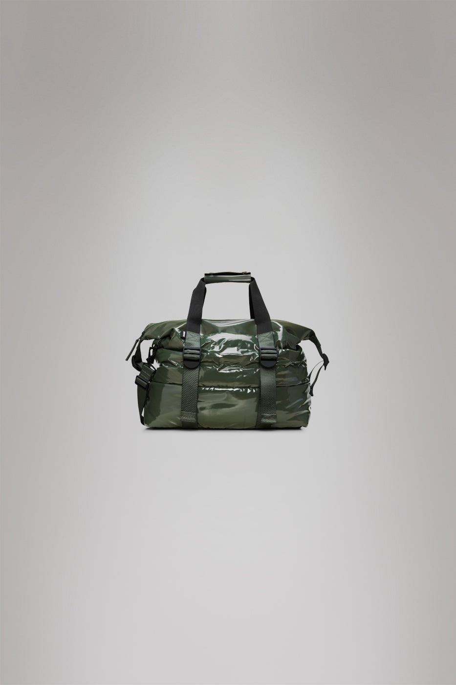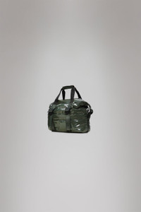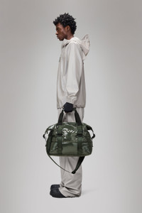 Puffer Mix Weekend Bag Small is a restyled version of the classic Hilo Weekend Bag. This playful design features a spacious main compartment with room for clothing, tech and more, and an internal zip pocket for smaller valuables. On the exterior, adjustable front straps hold space for extra storage. It’s the perfect overnight bag, when traveling light. Puffer Mix Weekend Bag Small is finished off with webbing carry handles and attachment rings for an included detachable shoulder strap. Once packed, secure belongings via the side-mounted compression straps. Puffer Mix Weekend Bag Small mixes the iconic puffer aesthetic with Rains’ well-known functionality and durability. It’s cut from signature waterproof PU fabric, engineered for carrying strength and a smooth feel. SKU: 14060\127 Details Dimensions: 10.6 in x 10.2 in x 20.5 in Capacity: 9.5 gal Composition: 100.00% PES (Polyester) Water column: 5000 mm Weight: 28.2 oz Features - Waterproof signature PU fabric - Coated zip closure - Single main compartment - Internal secure zip pocket - Side compression straps - Adjustable front straps for exterior storage - Detachable adjustable webbing shoulder strap - Webbing carry handles with handle wrap - Silicone flag label