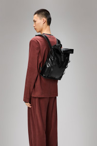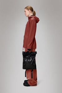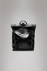 Sibu Rolltop Rucksack Mini is a dependable companion for daily commutes. It's cut from technical polyester and coated for all-weather protection. Sibu Rolltop Rucksack Mini is designed with intention, keeping its weight low and practicality high. This mini rucksack revises its full-sized counterpart with compact proportions characterized by a convenient rolltop opening. To protect essentials from rain, fold the rolltop into a tight scroll and secure using the signature carabiner. Open to reveal a single main compartment with a smaller mesh pocket for loose essentials. A zipped laptop compartment at the back keeps tech safe on daily commutes in all weathers. Externally, the design is fitted with a discreet front slip pocket, logo-jacquard webbing trims and adjustable compression shoulder straps. Sibu Rolltop Rucksack Mini is cut from Rains' technical polyester finished with a waterproof TPU coating. The design is sleek and lightweight with a great durability. SKU: 14740\01 Details Volume (liter): 2.6 gal Composition: 100.00% PA (Nylon) Water column: 10.000 mm Weight: 15.9 oz Features - Technical polyester with TPU coating - Rolltop opening with snap compression and signature carabiner - Single main compartment - Front slip pocket - Internal mesh slip pocket - Back compartment fits 13" laptop - Adjustable compression shoulder straps - Webbing storage loops - Logo-jacquard webbing trims