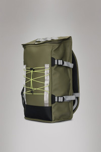 Trail Mountaineer Bag has a clear outdoor inspiration, resulting in a functional and sporty backpack. Characterized by a boxy silhouette and sporty details. This waterproof bag with a squared silhouette opens up to a spacious main compartment. Features include a zip pocket at top flap and a mesh water bottle pocket at side. The outside is equipped with bungee cords for external storage. This design leans into the sports-utility mood of the Trail family. It is detailed with webbing-strap-mounted buckles to compress the bag, keeping contents in place. Trail Mountaineer Bag is worn by the padded shoulder straps and secured by a chest strap. Trail Mountaineer Bag is cut from Rains' signature PU fabric, engineered for carrying strength, durability and a smooth feel. SKU: 14340\134 Details Dimensions: 19.3 in x 6.7 in x 11.8 in Composition: 100.00% PES (Polyester) Water column: 8000 mm Weight: 31 oz Features - Coated zip opening - Single main compartment - Zip pocket in top flap - Mesh bottle pocket - External back zip pocket - Padded pocket fits 16” device - Side compression straps with buckles - Bungee cord external storage - Adjustable padded backstraps - Webbing carry handle - Adjustable chest strap - This product is designed to withstand light to moderate weather conditions