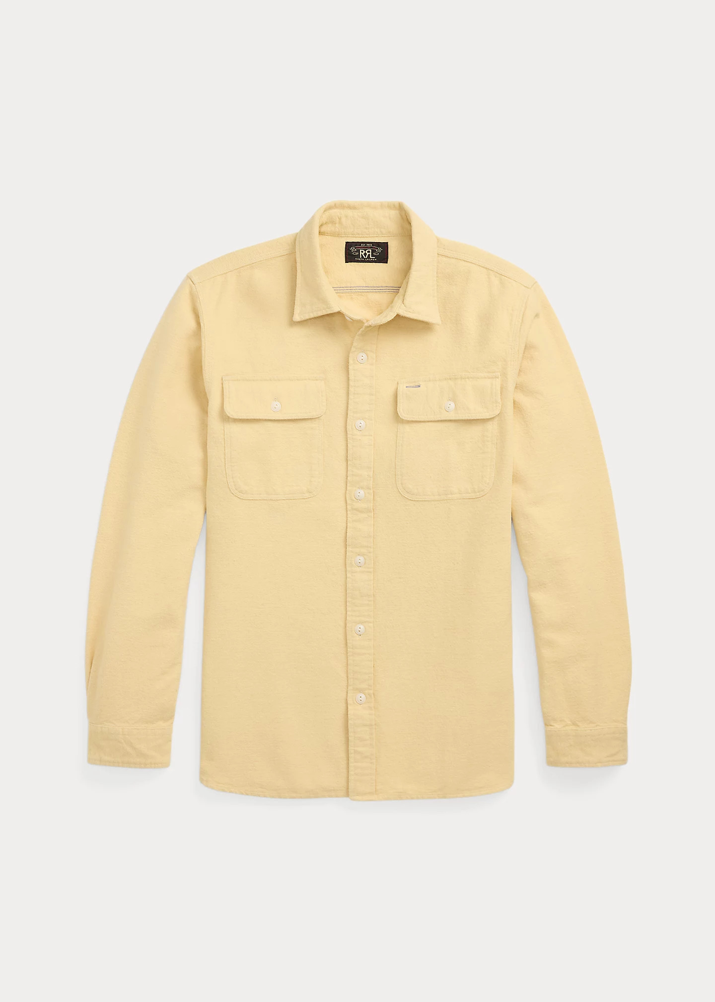 Slightly oversize fit. Made with medium-weight cotton chamois cloth. Brushed finish. Details inspired by 1950s workshirts. Washed to achieve tonal dimension along the seams and an authentic timeworn effect. DETAILS - Slightly oversize fit. - Size medium has a 29.75" back body length, an 18.75" shoulder, a 44" chest, and a 34.75" sleeve length. Sleeve length is taken from the center back of the neck. - Straight collar. Buttoned placket. - Long sleeves with buttoned barrel cuffs. - Two chest buttoned pockets. - 100% cotton. - Machine washable. - Imported. - Style Number: 100059681