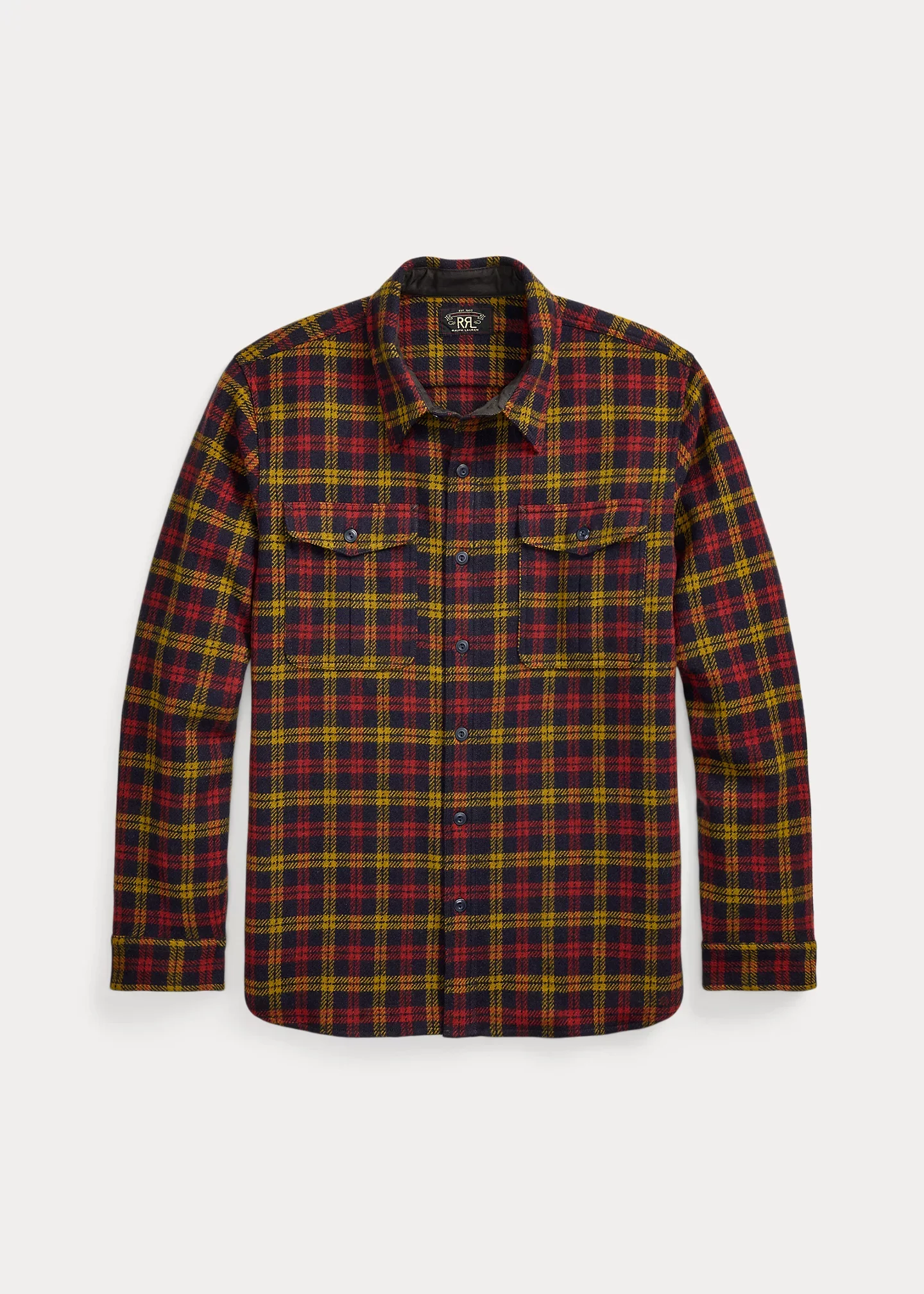 Made with checked wool twill that is inspired by a vintage textile. Two buttoned pockets at the chest. DETAILS - Workshirt Fit: Double RL’s slightly more relaxed fit with more ease through the body and sleeves. - Size medium has a 29.5" back body length, an 18.75" shoulder, a 44" chest, and a 34.75" sleeve length. Sleeve length is taken from the center back of the neck. - Straight collar. Buttoned placket. - Long sleeves with buttoned barrel cuffs. - Two chest buttoned pockets. - 100% wool (exclusive of decoration). - Hand wash or dry clean. - Imported. - Style Number: 100059670