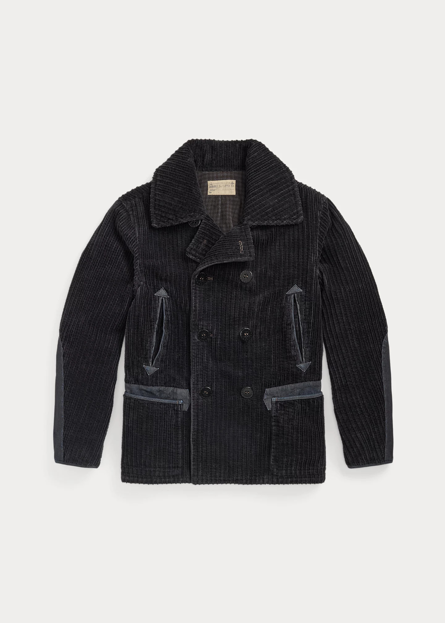 Based on a coat from the late 19th century. Made with cotton corduroy of variegated wale widths. Detailed with coated indigo denim from Japan. Brushed houndstooth twill lining at the body. Brushed chamois pocket bags. Anchor-engraved corozo buttons. DETAILS - Size medium has a 29.25" front body length, a 28.5" back body length, an 18" shoulder, a 44.5" chest, and a 35" sleeve length. Sleeve length is taken from the center back of the neck. - Notch lapels. Buttoned throat latch. Double-breasted silhouette. Anchor-engraved corozo buttons. - Long sleeves with denim forearm patches. Denim trim at the cuffs. - Two hand-warmer pockets with denim triangular reinforcements. Two front waist patch pockets with denim trim. Interior left chest pocket. Interior right waist pocket. - Single vent. - Fully lined. Body is lined with brushed houndstooth twill. - Shell, trim, and body lining: 100% cotton. Sleeve lining: 100% viscose. - Machine washable. - Imported. - Style Number: 100056704