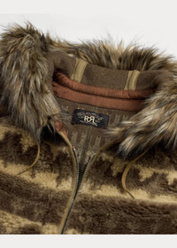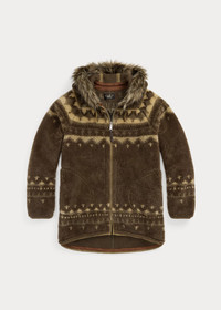 Surplus-inspired liner-jacket model. Made from high-pile fleece with a tonal geometric pattern. Faux-fur trim at the hood. Raglan sleeves. Brushed chamois lining at the hand-warmer pockets. DETAILS - Size medium has a 31.5" front body length, a 33.75" back body length, a 46.5" chest, and a 35" sleeve length. Sleeve length is taken from the center back of the neck. - Drawstring hood with faux-fur trim. Full-zip front. Leather stoppers and zipper pull. Cotton tape binding. - Long raglan sleeves. Elasticized binding at the cuffs. - Two hand-warmer pockets with chamois lining. - Drawstring hem. Unlined. - Shell: 67% polyester, 33% acrylic. Faux-fur hood trim: 57% acrylic, 29% modacrylic, 14% polyester. - Dry clean. - Imported. - Style Number: 100065513