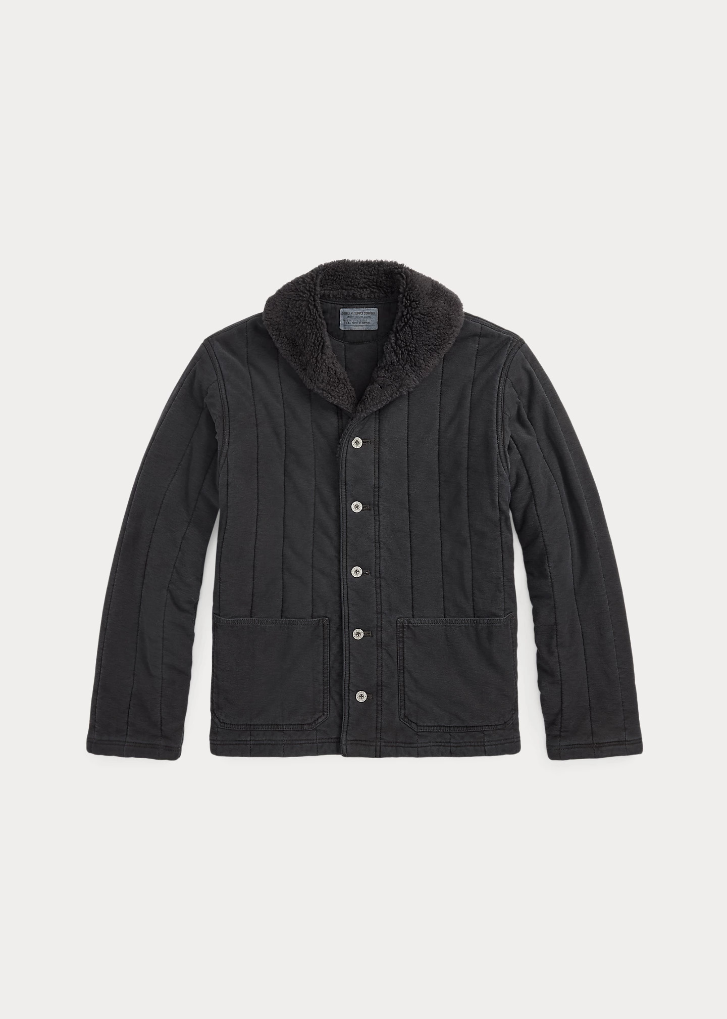 Surplus-inspired jacket made with cotton jersey. High-pile wool-blend fleece shawl collar. Channel-quilted design with insulation. Indigo-dyed oxford facing at the lower placket. Self-lined. Heavily washed to create tonal dimension and a faded look. Metal buttons. DETAILS - Size medium has a 28" front body length, a 19" shoulder, a 46" chest, and a 34.25" sleeve length. Sleeve length is taken from the center back of the neck. - High-pile fleece shawl collar. Buttoned placket. Oxford facing at the lower placket. Metal buttons. - Long sleeves. - Two front waist patch pockets. - Fully lined and filled. - Shell and lining: 100% cotton. Fill: 100% polyester. Collar: 75% wool, 25% polyester. - Dry clean. - Imported. - Dyed with true indigo, which may rub off onto fabrics, leather, and upholstery. - Style Number: 100057953