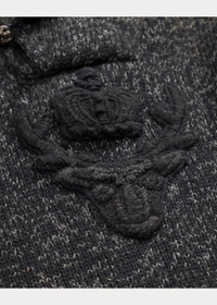 Made with wool-and-linen yarns that are pre-twisted to create a heathered effect. Inspired by a sweater from the ’60s. Hand-embroidered with a reindeer-and-crown graphic. Ribbed cuffs and hem. Deer-embossed metal button at the shawl collar. Crafted in collaboration with Manos del Uruguay, a nonprofit collective of rural artisan women that promotes social and economic development. DETAILS - Size medium has a 25" body length, a 17" shoulder, a 40.5" chest, and a 24.75" sleeve length. - Shawl collar with a buttoned closure at the right side. Deer-embossed metal button. - Long sleeves with rib-knit cuffs. - Reindeer-and-crown graphic hand-embroidered at the center front. - Rib-knit hem. - 98% wool, 2% linen. - Dry clean. - Made in Uruguay. - Style Number: 100064793