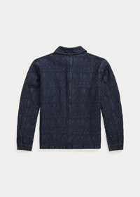 Made from a textured jacquard-woven fabric that is dyed with true indigo. Denim collar, cuffs, and pocket reinforcements. Vintage-inspired metal buttons. Washed to achieve tonal dimension. DETAILS - Overshirt fit. - Size medium has a 27.25" back body length, a 19" shoulder, a 46.75" chest, and a 35.5" sleeve length. Sleeve length is taken from the center back of the neck. - Shawl collar. Buttoned placket. Metal buttons. - Long sleeves with buttoned barrel cuffs. - Left chest patch pocket. Right chest buttoned pocket. Two front waist patch pockets. Interior left chest pocket. - 76% cotton, 23% polyester, 1% elastane. - Machine washable. - Imported. - Dyed with true indigo, which may rub off onto fabrics, leather, and upholstery. - Style Number: 100056589