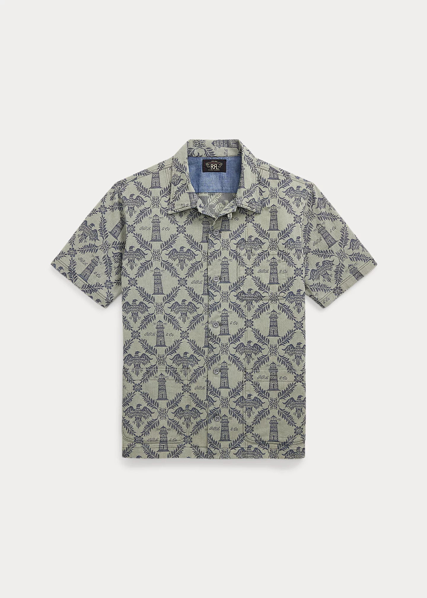 Made with jacquard-woven denim that is yarn-dyed with indigo. Eagle-and-lighthouse motif is inspired by a vintage blanket. Japanese chambray lining at the back yoke and pockets. Metal buttons with a corroded finish. Washed to achieve tonal dimension and an authentic timeworn effect. DETAILS - Size medium has a 28.5" body length, an 18.5" shoulder, and a 45" chest. - Camp collar. Buttoned placket. Metal buttons with a corroded finish. - Short sleeves. - Left chest patch pocket. Two front waist patch pockets. - Straight hem. - Chambray lining at the back yoke and pockets. - 100% cotton. - Machine washable. Imported. - Due to the natural characteristics of this product, the coloring may rub off onto fabrics and upholstery. - Style Number: 100056590