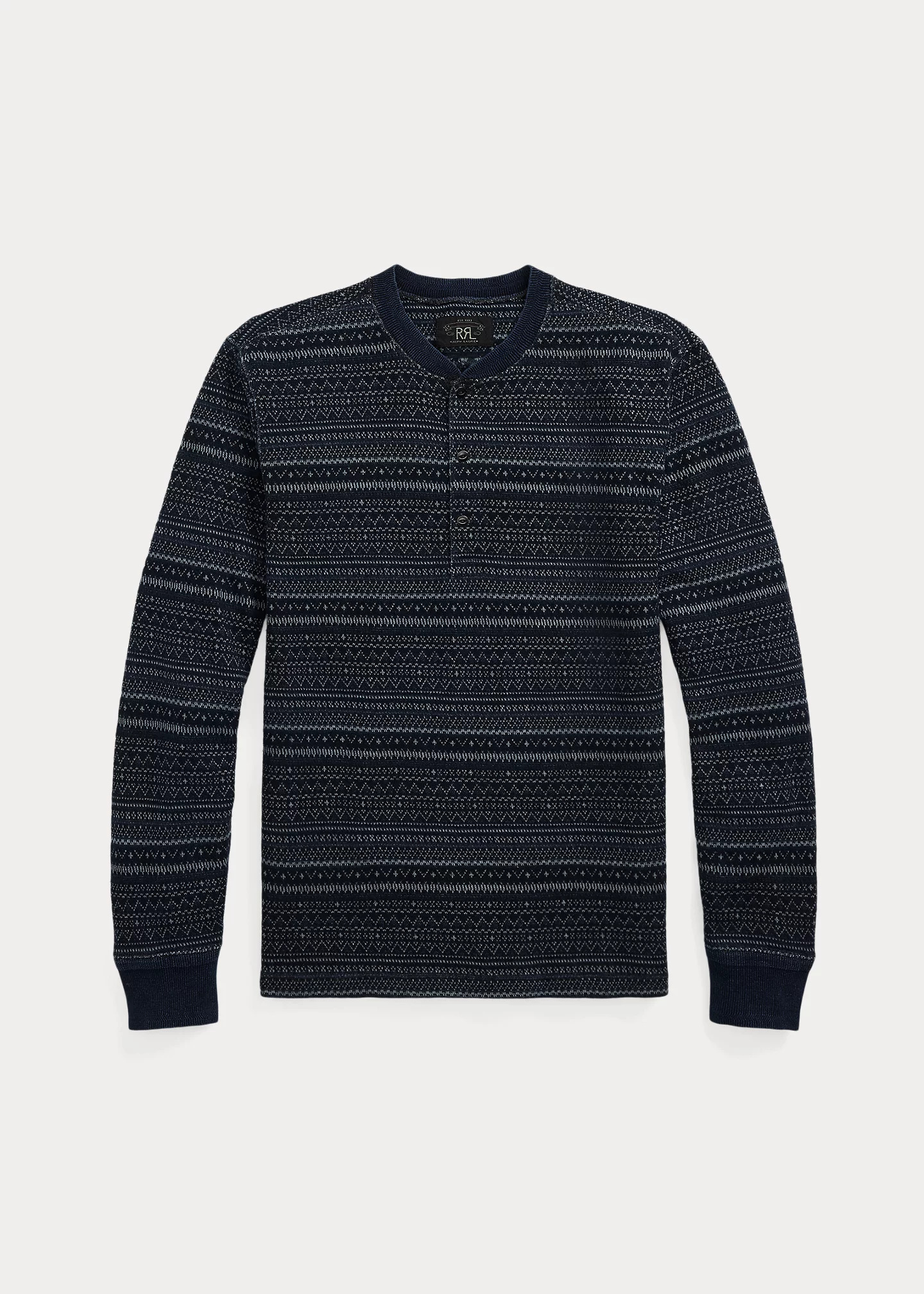 Made with cotton jacquard that is yarn-dyed with true indigo. Pattern and color are inspired by a vintage swatch. Woven placket facing. Ribbed trims. Washed for softness. DETAILS - Size medium has a 26.75" front body length, a 17.5" shoulder, a 39.25" chest, and a 34.5" sleeve length. Sleeve length is taken from the center back of the neck. - Henley neckline. Three-button placket with woven facing. Enameled metal buttons. - Long sleeves with ribbed cuffs. - 100% cotton. - Machine washable. - Imported. - Dyed with true indigo, which may rub off onto fabrics, leather, and upholstery. - Style Number: 100066410