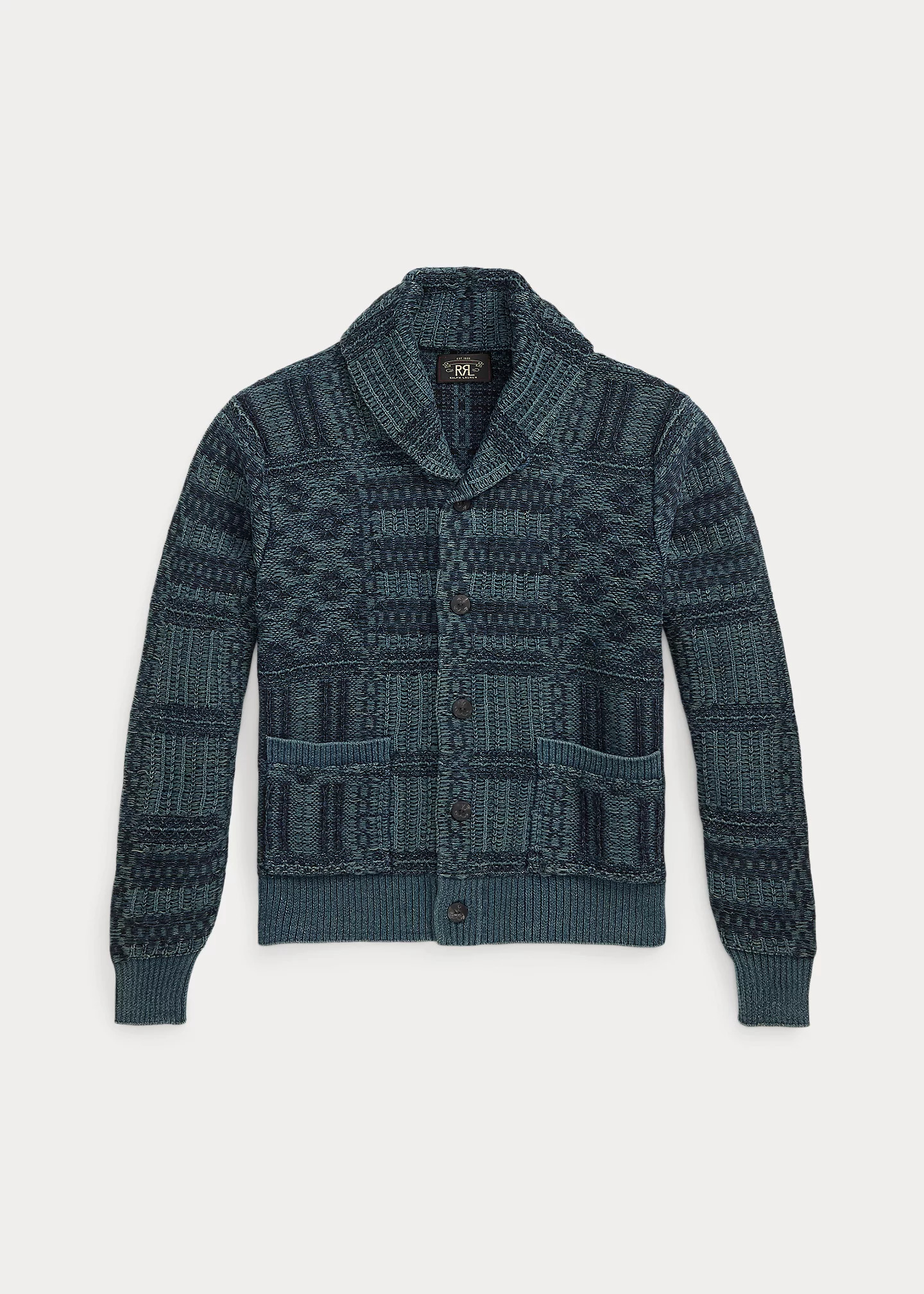 Shawl-collar cardigan made with indigo-dyed cotton yarns. Knit using a ladder-back float-jacquard technique to create a highly textured effect. Inspired by a 1960s overshot blanket. Ribbed cuffs and hem. Anchor-engraved genuine horn buttons. DETAILS - Size medium has a 25.25" front body length, a 17.75" shoulder, a 42" chest, and a 25.5" sleeve length. - Shawl collar with a buttoned closure at the right side. Five-button placket. Anchor-engraved genuine horn buttons. - Long sleeves with rib-knit cuffs. - Two front waist patch pockets. - Rib-knit hem. - 100% cotton. - Machine washable. - Imported. - Dyed with indigo, which may rub off onto fabrics, leather, and upholstery. - Style Number: 100056215