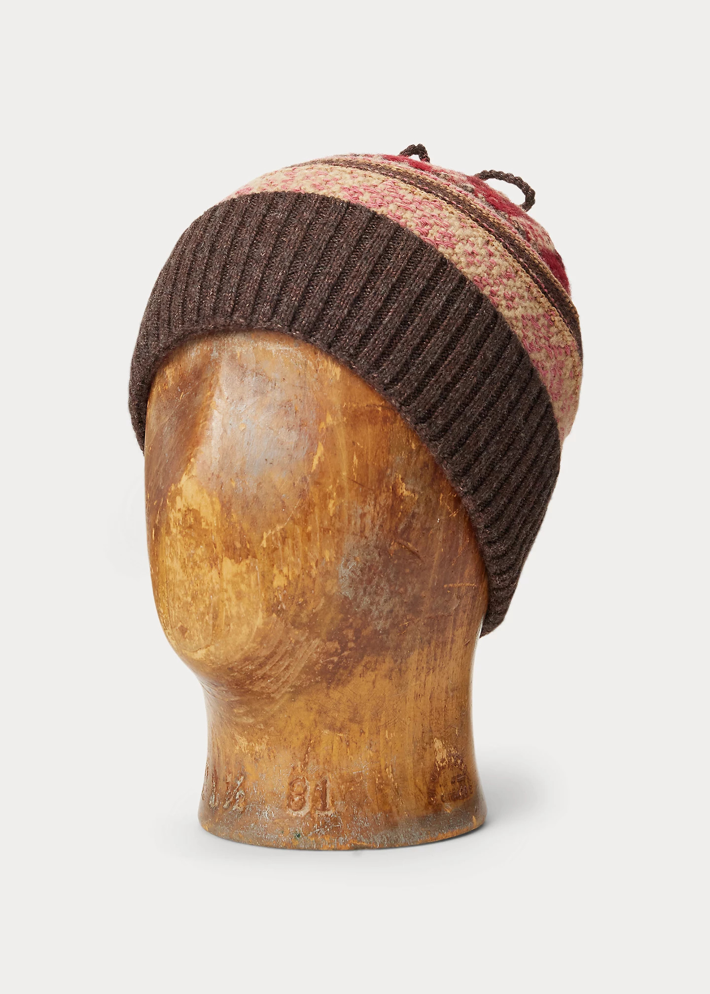 Watch cap made with wool, linen, and mulberry silk yarns. Inspired by a blanket from the ’60s. Jacquard-knit with a variety of stitches throughout. Braided crochet loops at the top. Ribbed cuff. DETAILS - 2.5" fold-over rib-knit cuff. - 9.75" width at bottom edge. - 59% wool, 24% linen, 17% silk. - Hand wash or dry clean. - Imported. - Style Number: 100068263