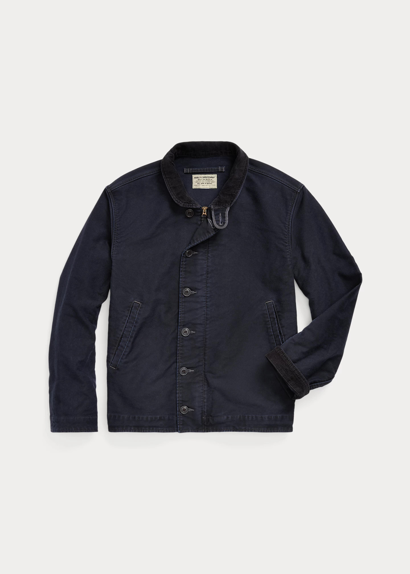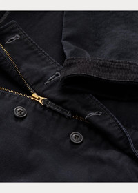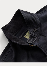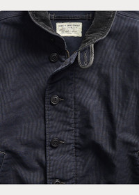 Based on a nautical deck jacket. Made from jungle cloth, a durable grosgrain-weave fabric used in flight apparel. Updated details include a half-lined interior and Japanese buttons. Fine-wale corduroy collar. Dyed and tint-washed for subtle color variations throughout. DETAILS - Size medium has a 25½" back body length, a 19" shoulder, a 45½" chest, and a 33¾" sleeve length. Sleeve length changes 1" between sizes. - Corduroy shawl collar. Buttoned collar tab. Full-zip front. Buttoned placket. - Long sleeves. Corduroy at the cuff facing. Ventilating metal grommets at the underarms. - Two front waist welt pockets. Interior left waist pocket. - Drawstring hem. Lined at the front body. - Cotton. - Machine washable. - Imported. Style Number: 538590