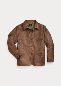 Made with full-grain cowhide. Inspired by vintage car coats. Adjustable buttoned tabs at the back waist. Body is lined with olive-hued herringbone twill. Specially developed for a vintage look. DETAILS - Size medium has a 28.25" front body length, a 27.5" back body length, an 18.25" shoulder, a 45.5" chest, and a 34" sleeve length. Sleeve length is taken from the center back of the neck. - Straight collar. Buttoned throat latch. Buttoned placket. Corozo buttons. - Long sleeves with buttoned barrel cuffs. - Left chest besom pocket. Two front waist besom pockets. - Adjustable buttoned tabs at the back waist. - Fully lined. Body is lined with olive-hued herringbone twill. - Shell: 100% leather. Body lining: 100% cotton. Sleeve lining: 100% polyester. - Dry clean by a leather specialist. Imported. - Due to the natural characteristics of this material, the coloring may rub off onto fabrics and upholstery. - Style Number: 100028804