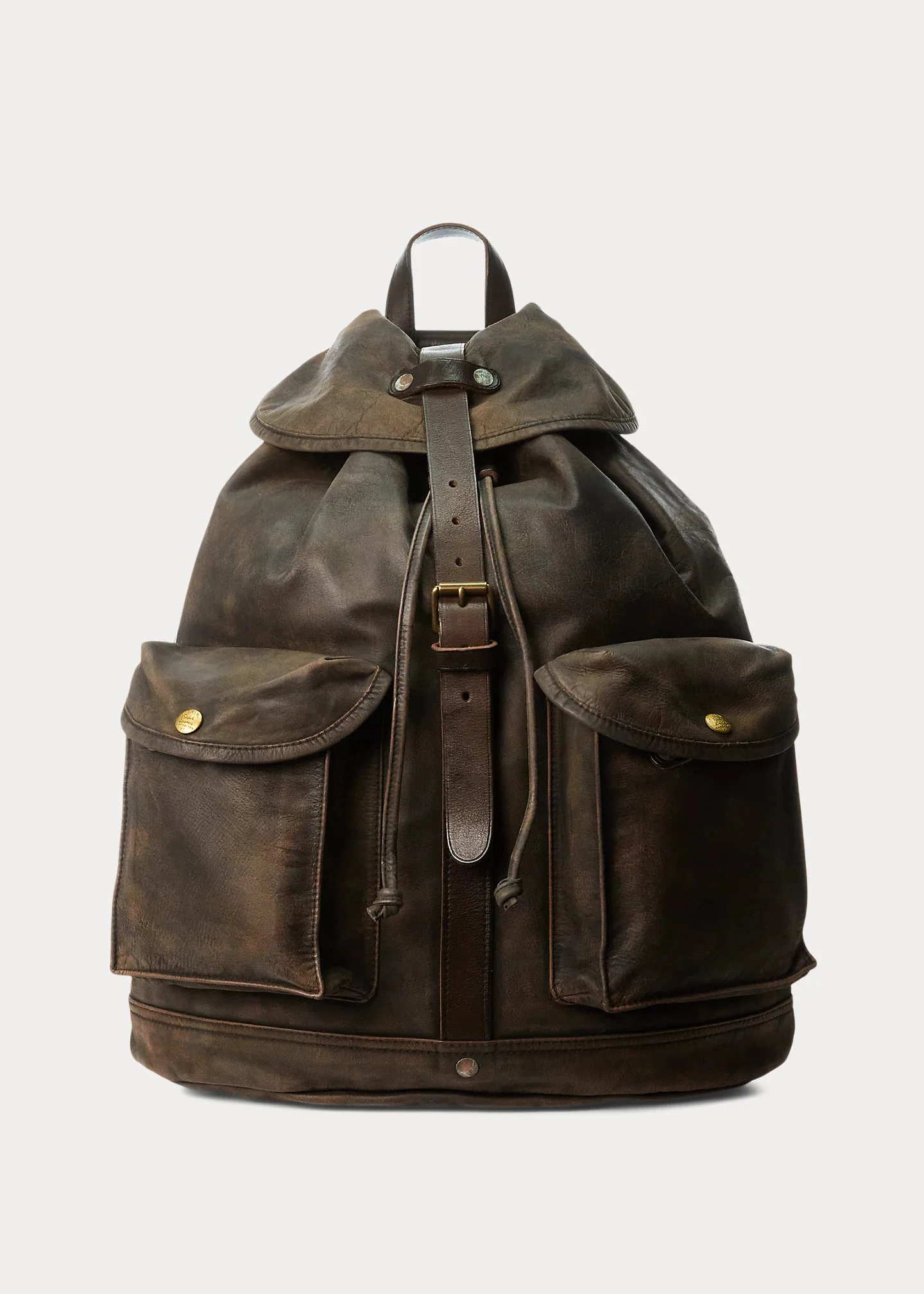 Iconic rucksack model made from lightweight, supple buffalo hide. Vegetable-tanned cow leather trim. Specially hand-finished for a timeworn look. Brass hardware and distressed copper-tone rivets. DETAILS - Leather top handle with a 3½" drop. Adjustable leather shoulder straps. - Fold-over flap with a buckled closure. Brass hardware. - Leather drawcord at the top. - Two front snapped pockets. - Reinforced base. Unlined. Distressed copper-tone rivets. - 16¾" H x 14" W x 6½" D. - Leather. - Imported. - Comes with a dust bag. Style Number: 617377