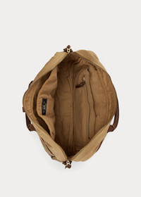 Made with durable cotton canvas. Full-grain leather handles, removable shoulder strap, and trim. Woven logo label with a deer graphic at the front. Padded laptop sleeve at the interior. Brass hardware with a vintage-inspired finish. Distressed copper-tone rivets. DETAILS - Two leather top handles, each with a 3" drop. Removable, adjustable buckled leather shoulder strap with a 23" drop. - Two-way top zip closure with leather zipper pulls. - Two snapped side pockets. Back snapped pocket. Interior padded laptop sleeve. Interior slip pocket with an additional zip pocket. - Leather trim. Distressed copper-tone rivets. - “Double RL & Co. Great Western Company” deer label at the front. - Lined with canvas. - 11.5" H x 16" W x 4" D. - Shell and lining: cotton. Trim: leather. - Imported. Style Number: 659232