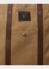 Made with durable cotton canvas. Full-grain leather handles and trim. Webbed shoulder strap. Woven logo label with a deer graphic at the front. Distressed copper-tone rivets. DETAILS - Two leather top handles, each with a 4" drop. Webbed shoulder strap with a 21" drop. - Snapped closure at the top. - Front snapped pocket. Two interior slip pockets. - Leather trim. Distressed copper-tone rivets. - “Double RL & Co. Great Western Company” deer label at the front. - Unlined. - 18" H x 16" W. - Shell: cotton. Trim: leather. - Imported. Style Number: 659233