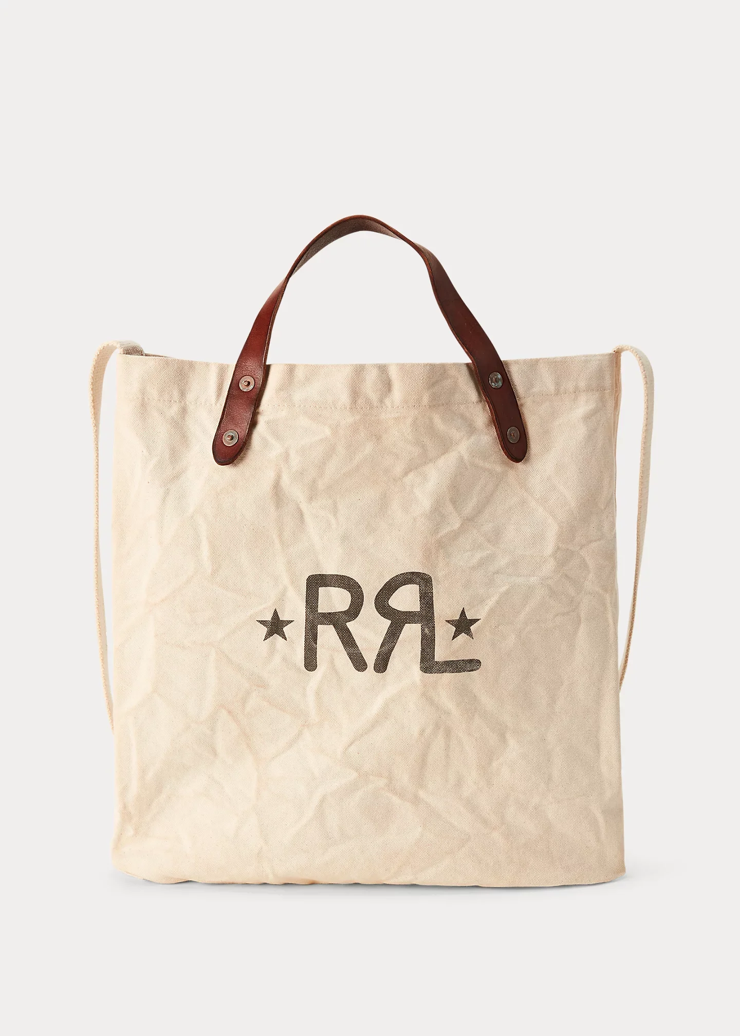 Cut from natural cotton canvas. Full-grain leather top handles. “RRL” logo and stars screen-printed at the front. Unlined. DETAILS - Two leather top handles, each with a 4" drop. Webbed cotton shoulder strap with a 19½" drop. - Snapped closure at the top. - Copper-tone rivets. - "RRL" logo and stars screen-printed at the front. - Unlined. - Two interior pockets. - 16½" H x 15¾" W. - Shell: cotton. Trim: leather. - Imported. Style Number: 538878