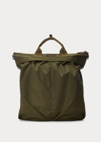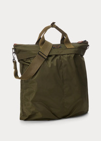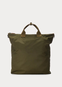 Constructed with durable yet lightweight nylon canvas. Inspired by vintage surplus bags. Webbed top handles and removable shoulder strap. Self-lined. Leather zipper pulls. Solid brass hardware with a black oxidized finish. DETAILS - Two webbed top handles, each with a 3" drop. Removable, adjustable webbed shoulder strap with a 23" drop. - Top zip closure with a leather zipper pull. - Two front snapped pockets. Interior zip pocket. - "RRL" winged-logo patch at the top. - Webbed trim. - Self-lined. - 19.5" H x 18" L. - Shell and lining: nylon. Trim: leather. Webbing: polyester. - Imported. Style Number: 659231