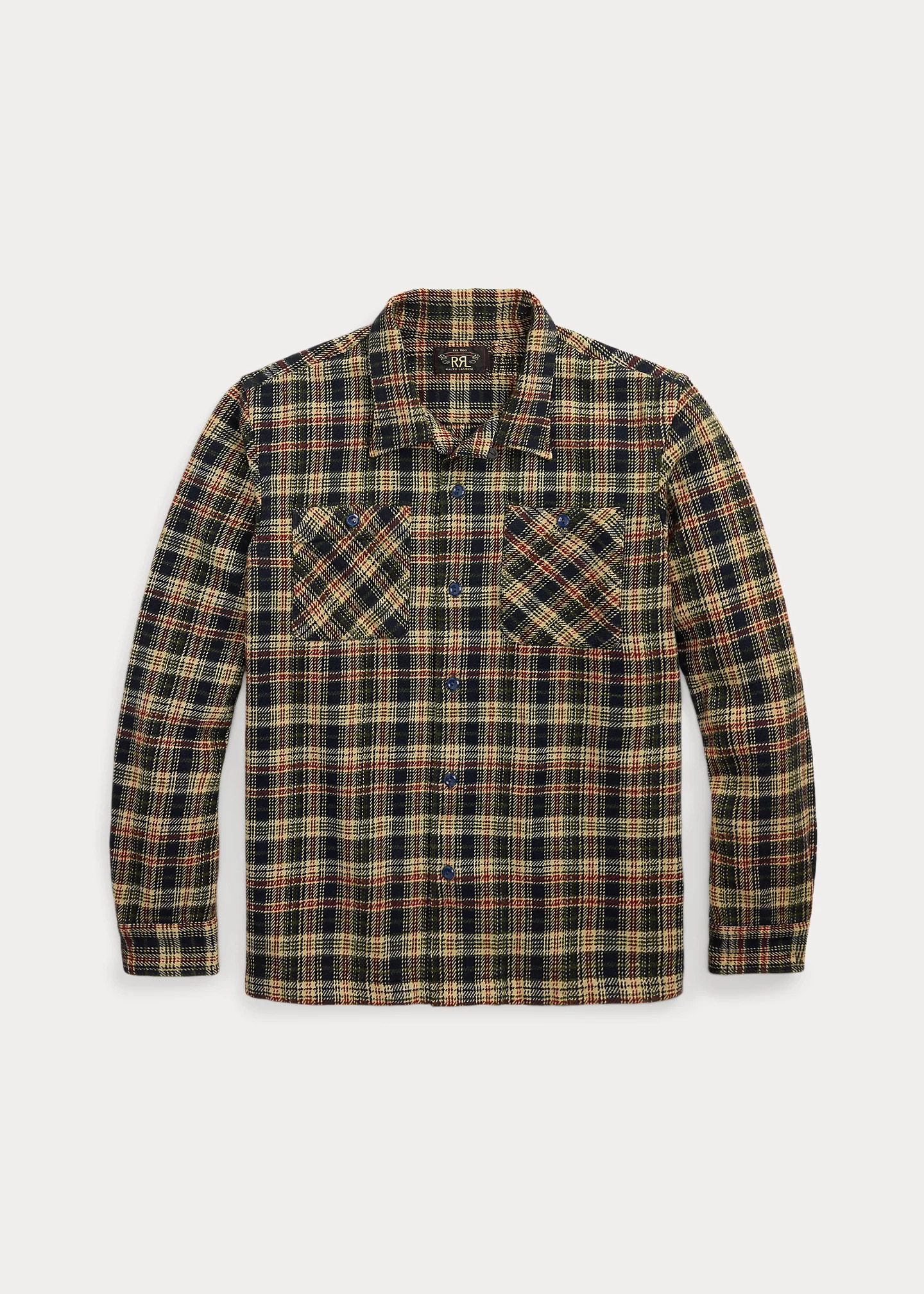Camp shirt made with heavyweight cotton twill. Yarn-dyed plaid pattern. Washed to achieve tonal dimension. DETAILS - Size medium has a 28.25" back body length, an 18.5" shoulder, a 44.75" chest, and a 35" sleeve length. Sleeve length is taken from the center back of the neck. - Camp collar. Buttoned placket. - Long sleeves with buttoned barrel cuffs. - Two chest buttoned pockets. - Straight hem. - 100% cotton. - Machine washable. - Imported. - Style Number: 100059667