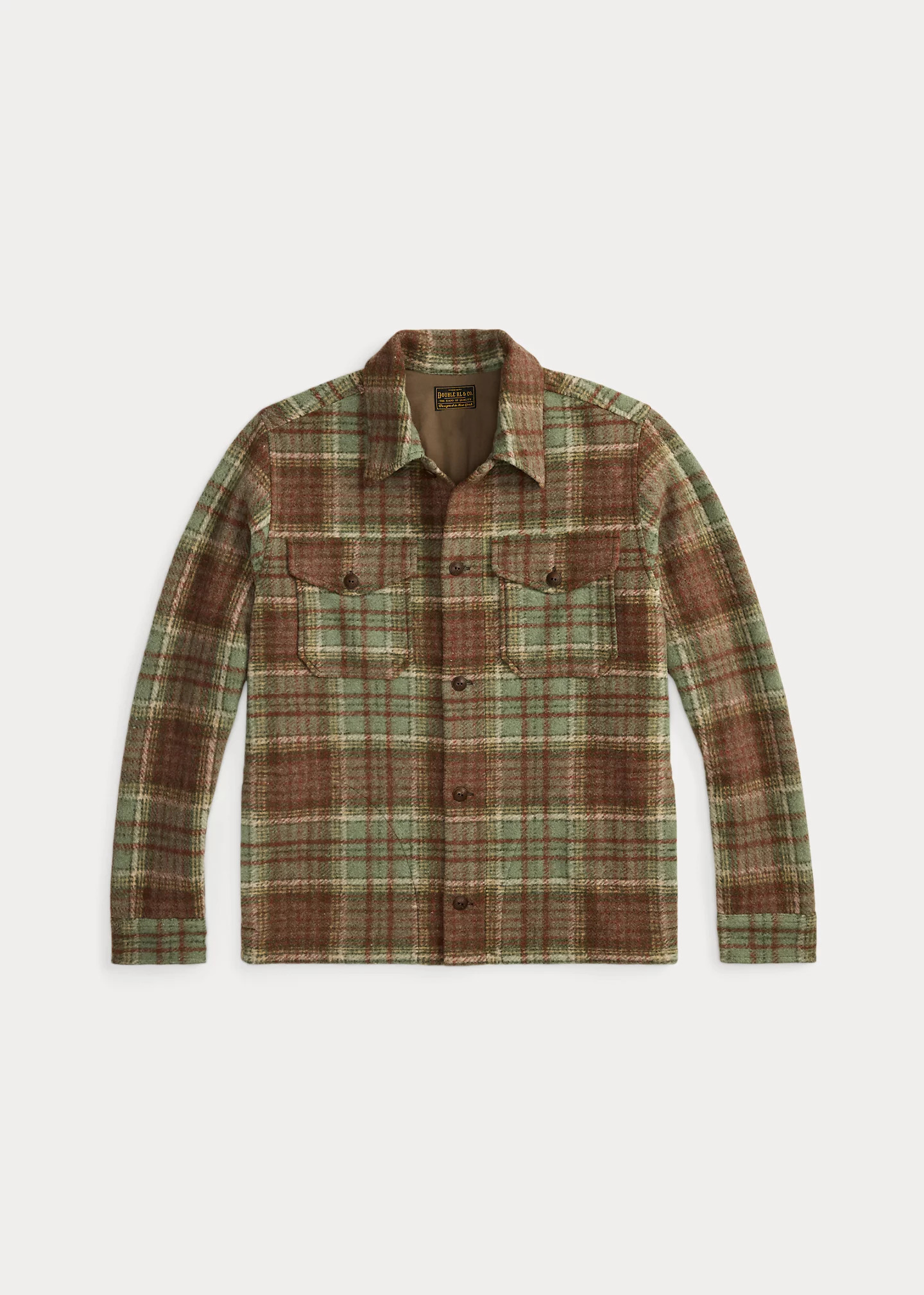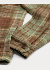 Fiber-dyed double-knit jacquard made with a wool blend. Brushed texture. Plaid pattern and color palette inspired by a vintage swatch. Woven reinforcements at the interior. Chamois lining at the hand-warmer pockets. Corozo buttons. DETAILS - Size medium has a 27.5" back body length, an 18" shoulder, a 45.5" chest, and a 34.75" sleeve length. Sleeve length is taken from the center back of the neck. - Straight collar. Buttoned placket. Corozo buttons. - Long sleeves with buttoned barrel cuffs. - Two chest buttoned pockets. Two hand-warmer pockets with chamois lining. - Woven reinforcements at the interior. - 73% wool, 27% polyester (exclusive of trim). - Dry clean. - Imported. - Style Number: 100062165