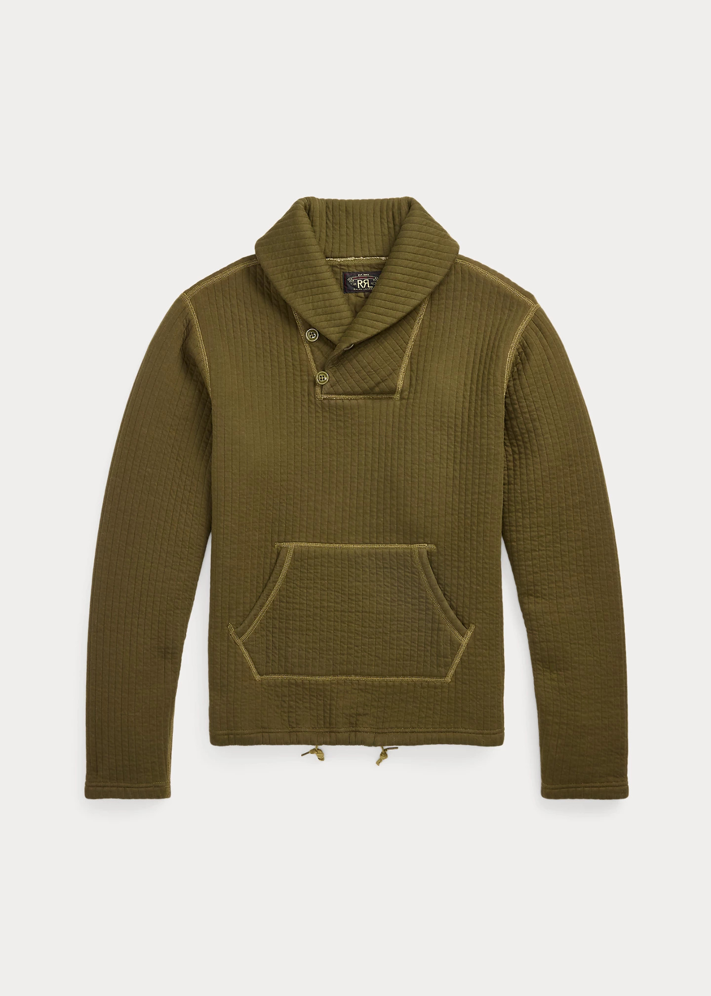 Made with double-knit cotton jacquard. Channel-quilted design with insulation. Drawstring hem. DETAILS - Size medium has a 26.5" front body length, an 18" shoulder, a 44" chest, and a 35.4" sleeve length. Sleeve length is taken from the center back of the neck. - Shawl collar with a two-button closure at the right side. - Long sleeves. - Kangaroo pocket. - Drawstring hem. Quilted interior. - Shell and interior: 100% cotton. Fill: 100% polyester. - Machine washable. - Imported. - Style Number: 100068112