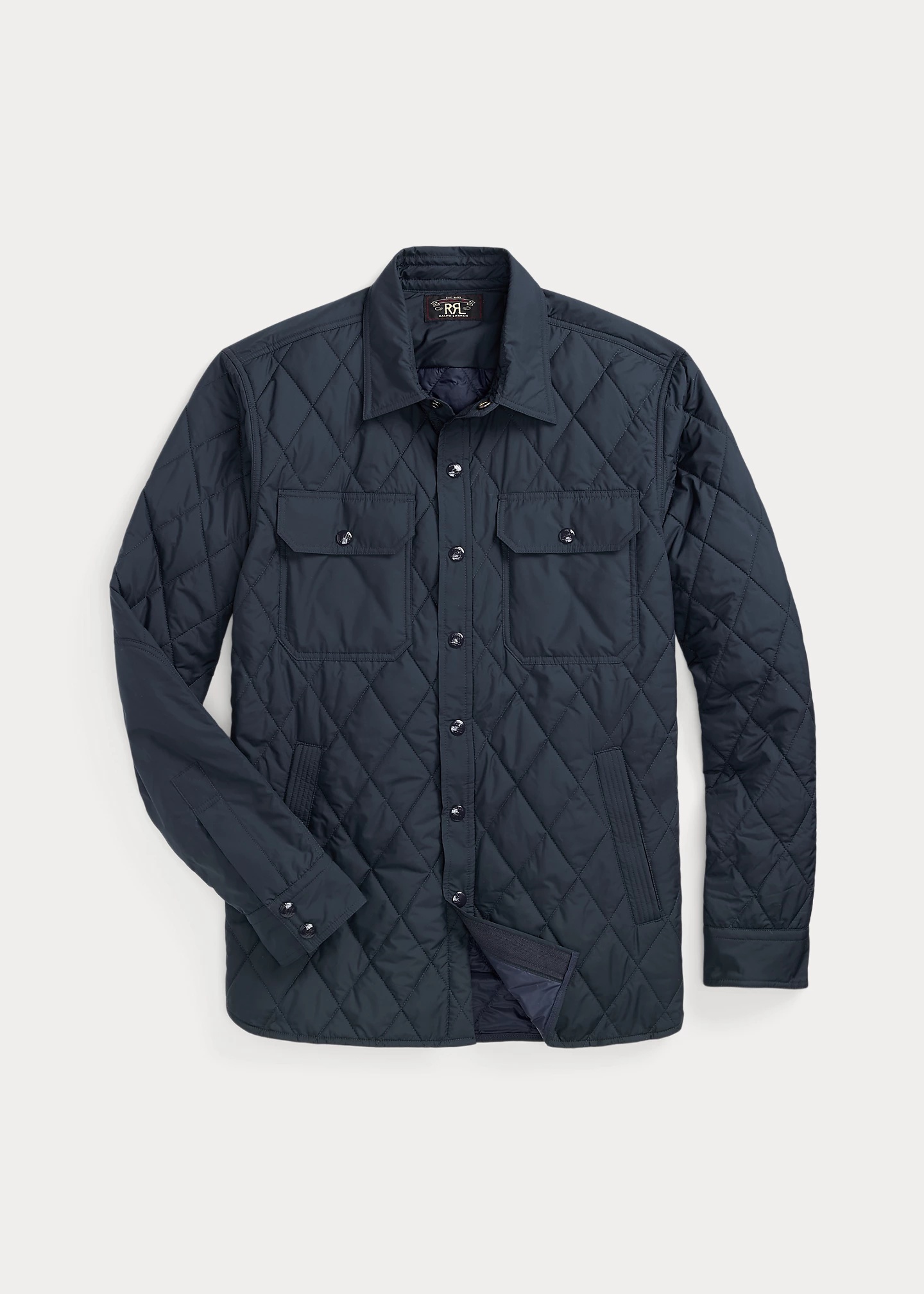 Utilitarian-inspired overshirt with a diamond-quilted design. Four pockets at the front. Tonal signature snaps. Insulated with a lightweight down-alternative fill. DETAILS - Size medium has a 30" back body length, an 18.5" shoulder, a 45.25" chest, and a 34.75" sleeve length. Sleeve length is taken from the center back of the neck. - Straight collar. Snapped placket. Signature snaps. - Long sleeves with snapped barrel cuffs. - Two chest snapped pockets. Two front waist angled pockets. - Fully lined and filled. - Shell and fill: 100% polyester. Lining: 100% nylon. - Machine washable. - Imported. - Style Number: 100007919