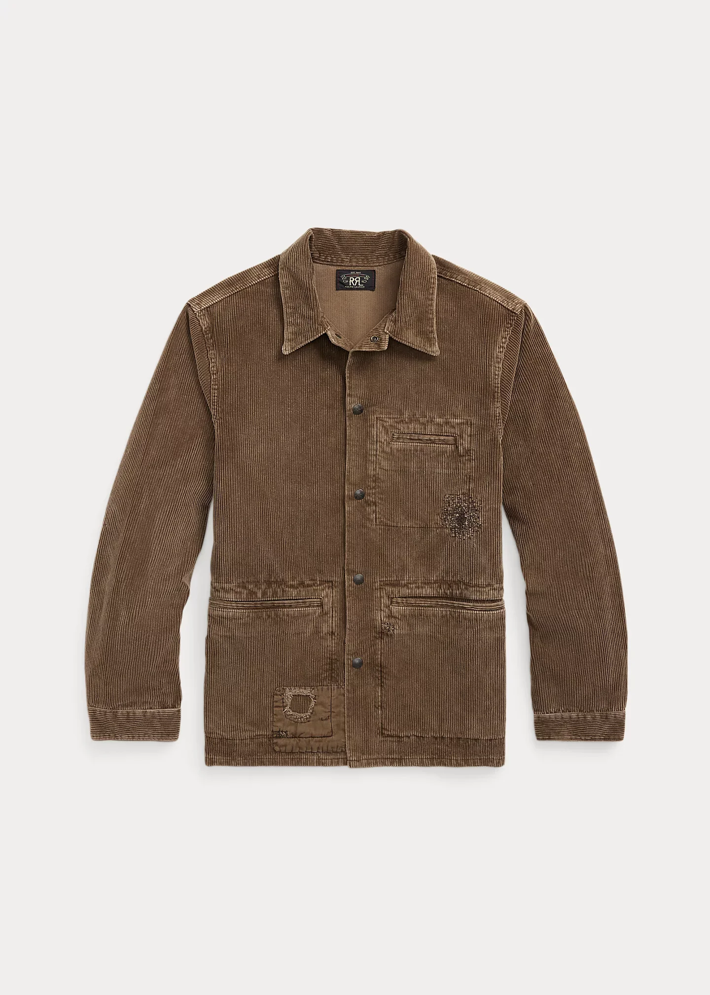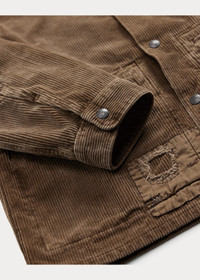 Made with wide-wale cotton corduroy that was sourced from a storied French mill that has been specializing in this type of fabric since the 1800s. Repaired with twill and contrasting corduroy. Heavily distressed for a lived-in look. Vintage-inspired custom snaps. DETAILS - Size medium has a 27.25" back body length, a 19.25" shoulder, a 46" chest, and a 34.75" sleeve length. Sleeve length is taken from the center back of the neck. - Straight collar. Snapped placket. Metal snaps custom-developed with a "Double RL Ralph Lauren Manhattan" logo. - Long sleeves with snapped barrel cuffs. - Left chest welt pocket. Two front waist welt pockets. - Twill and contrasting corduroy repairs throughout. Twill reinforcements at the interior. - 100% cotton. - Machine washable. - Imported. - Style Number: 100061092