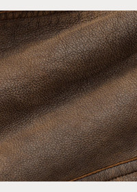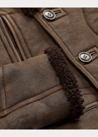 Made with soft, curly shearling in a chocolate-brown hue. Shawl collar. Unlined. Full-grain leather details. Corozo buttons. Specially developed for a vintage look and feel. DETAILS - Size medium has a 30.75" front body length, a 29.5" back body length, an 18.5" shoulder, a 45.5" chest, and a 35" sleeve length. Sleeve length is taken from the center back of the neck. - Shawl collar with a single button and leather-loop closure at the right side. Leather undercollar. Double-breasted silhouette. Corozo buttons. - Long sleeves. - Two hand-warmer pockets. Two front waist flapped pockets. - Unlined. - Shell: 100% dyed lamb shearling. Undercollar: 100% leather. - Spot clean. - Imported. Shearling origin: United Kingdom. - Due to the natural characteristics of this material, the coloring may rub off onto fabrics and upholstery. - Style Number: 100064286
