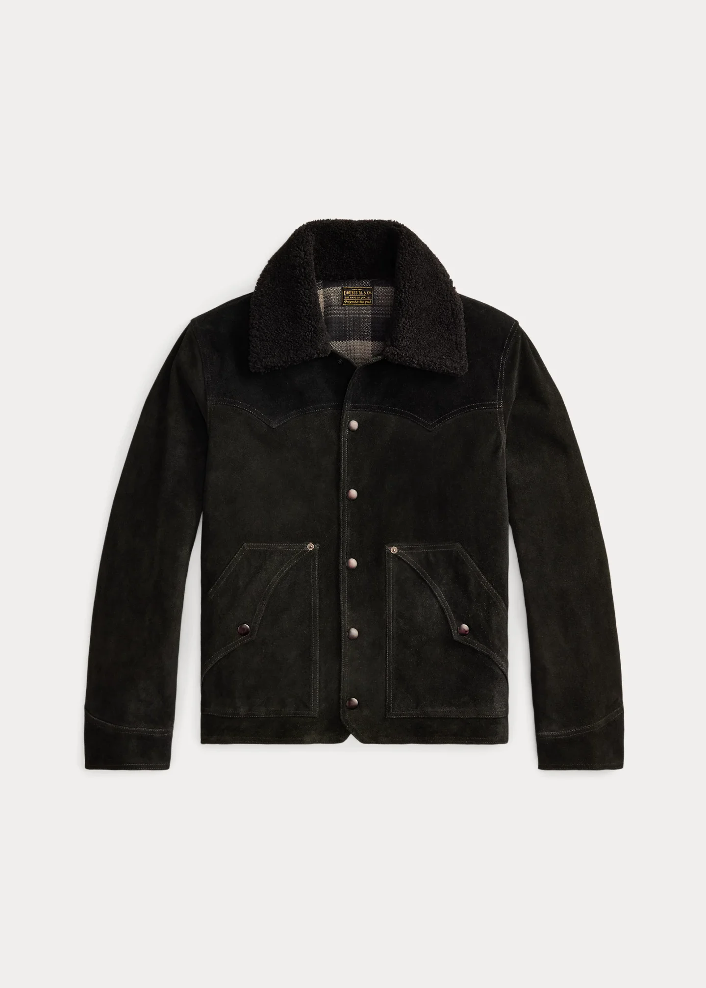 Shearling-collar jacket made with roughout suede. Western-style yokes and pockets. Brushed cotton lining at the body features a shadow-plaid pattern. DETAILS - Size medium has a 27" front body length, a 25.75" back body length, an 18.75" shoulder, a 46.75" chest, and a 35" sleeve length. Sleeve length is taken from the center back of the neck. - Shearling spread collar. Snapped placket. Western-style front and back yokes. - Long sleeves with snapped cuffs. - Two front waist snapped pockets. - Fully lined. Body is lined with plaid brushed cotton. - Shell and undercollar: 100% suede. Top collar: 100% dyed lamb shearling. Body lining: 100% cotton. Sleeve lining: 100% polyester. - Spot clean. - Imported. Shearling origin: United Kingdom. - Due to the natural characteristics of this material, the coloring may rub off onto fabrics and upholstery. - Style Number: 100082442