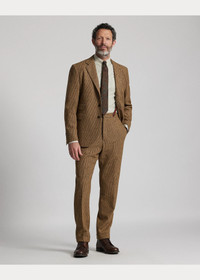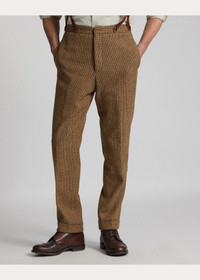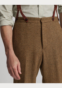 Slim-fitting trousers tailored in Italy. Checked wool cloth was custom-developed with a storied Irish mill. Split-back construction with an adjustable buckle. Half-lined. Genuine horn buttons. DETAILS - Slim fit. - Size 32W has a 10.5" rise and a 15.5" leg opening. - Belt loops. Button fly with a buttoned closure. Genuine horn buttons. Curtain waistband. Exterior buttons for braces. - Side on-seam pockets. Right hip coin pocket. Two back buttoned pockets. - Adjustable buckled back. - Lined to the knees. - Comes unhemmed with a 38" inseam. Alterations available in Ralph Lauren retail stores. - Shell: 100% wool. Lining: 51% cotton, 49% viscose. Dry clean. Made in Italy. - Model is 6'1" (185 cm) and wears a size 32W. - Style Number: 100059240