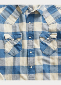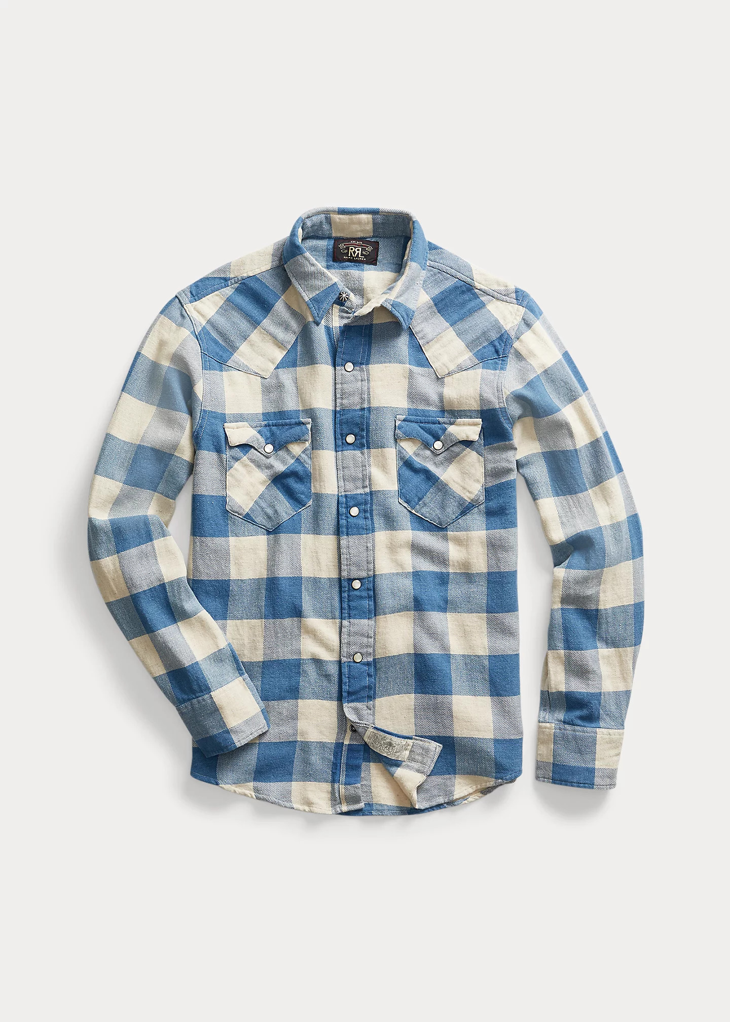 Slim-fitting shirt cut from lightweight cotton-and-linen twill. Indigo-dyed plaid pattern. Metal button at the collar. DETAILS - Western Fit: Double RL’s slimmest shirt silhouette. Cut trim through the body and the sleeves. - Size medium has a 30" back body length, a 17¾" shoulder, a 42¾" chest, and a 34¾" sleeve length. Sleeve length changes 1" between sizes. - Point collar with a metal button at the front. Snapped placket. - Long sleeves with snapped barrel cuffs. Western-style yoke. - Two chest snapped pockets. - 94% cotton, 6% linen. - Machine washable. - Imported. - Dyed with true indigo, which may rub off onto fabrics, leather, and upholstery. Style Number: 538586