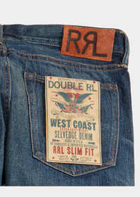 Made in America from Double RL’s most lightweight twill that offers a substantial look. Custom-developed 11.3 oz. selvedge denim is woven in Japan. Features a red-blue cast. High-contrast dark indigo wash with hand distressing. DETAILS - Slim Fit: a medium-low rise and a slim thigh and leg. - Size 32W has a 9" rise and a 14.5" leg opening. - Hand-set chain-stitched waistband with inserted belt loops for added durability. Button fly with our signature buttoned closure ensures a consistent fit through years of wear. - American-made buttons, rivets, and washer burrs. Five-pocket styling. "RRL" embroidery at the selvedge coin pocket. Twill pocket lining. - Leather "RRL"-debossed logo label at the back right waist. - Shell: 100% cotton. Patch: 100% leather. - Machine washable. For best results, wear 90 days without washing. - Made in USA with imported components. - Dyed with indigo, which may rub off onto fabrics, leather, and upholstery. - Style Number: 596851