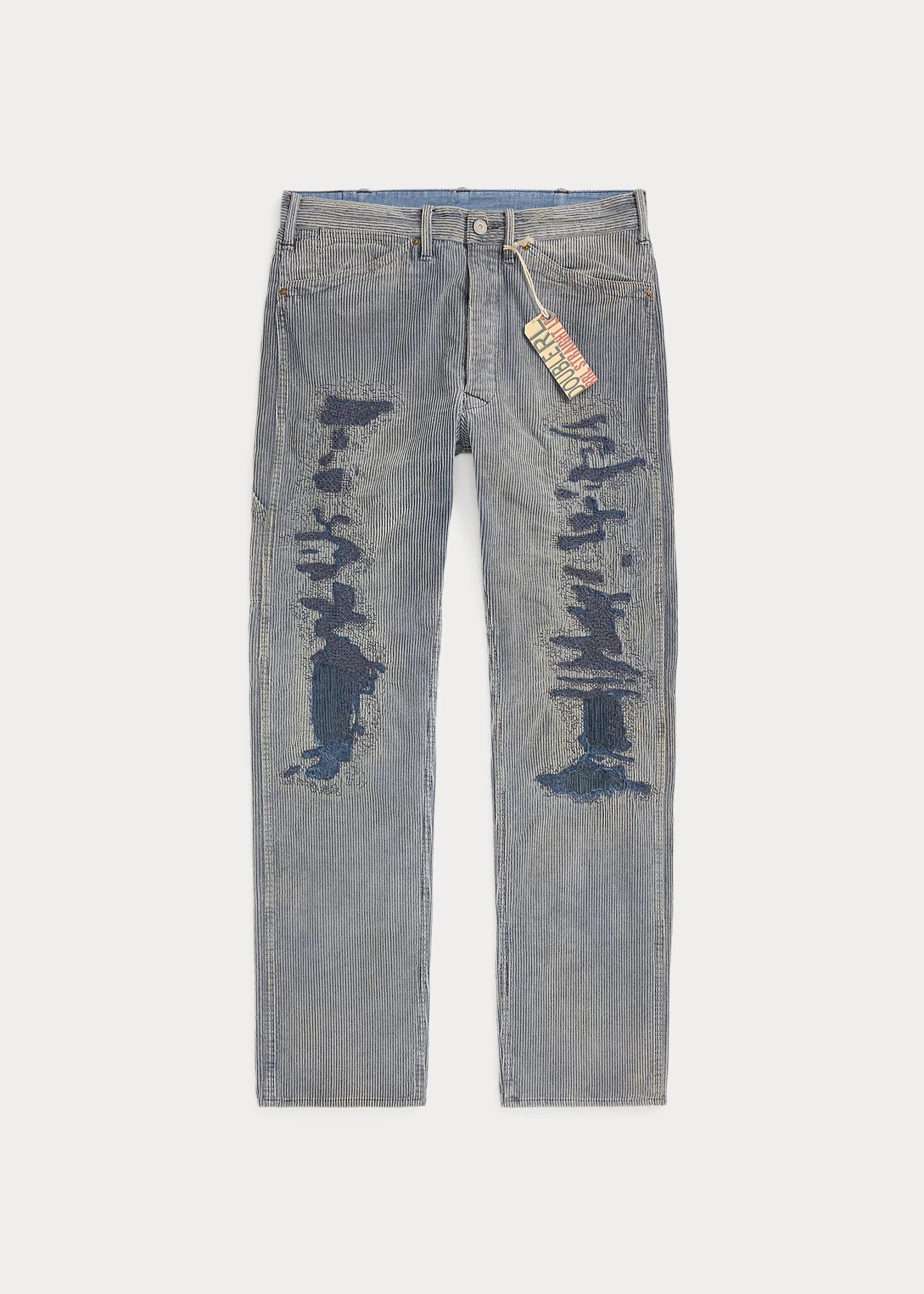 Wide-wale corduroy sourced from a storied French mill that has been specializing in corduroy since the 1800s. Button fly. Japanese chambray piecing throughout. Distressed and repaired. DETAILS - Straight Fit: a regular rise and a straight leg. - Size 32W has a 9.75" rise and a 17" leg opening. - Hand-set chain-stitched waistband with inserted belt loops for added durability. Button fly with our signature buttoned closure ensures a consistent fit through years of wear. - American-made buttons and rivets. Five-pocket styling. Right leg tool pocket. - “Double RL & Co. Overalls” label at the back right waist. Chambray piecing throughout. - 100% cotton. - Machine washable. - Imported. - Due to the natural characteristics of this material, the coloring may rub off onto fabrics and upholstery. - Style Number: 100062171